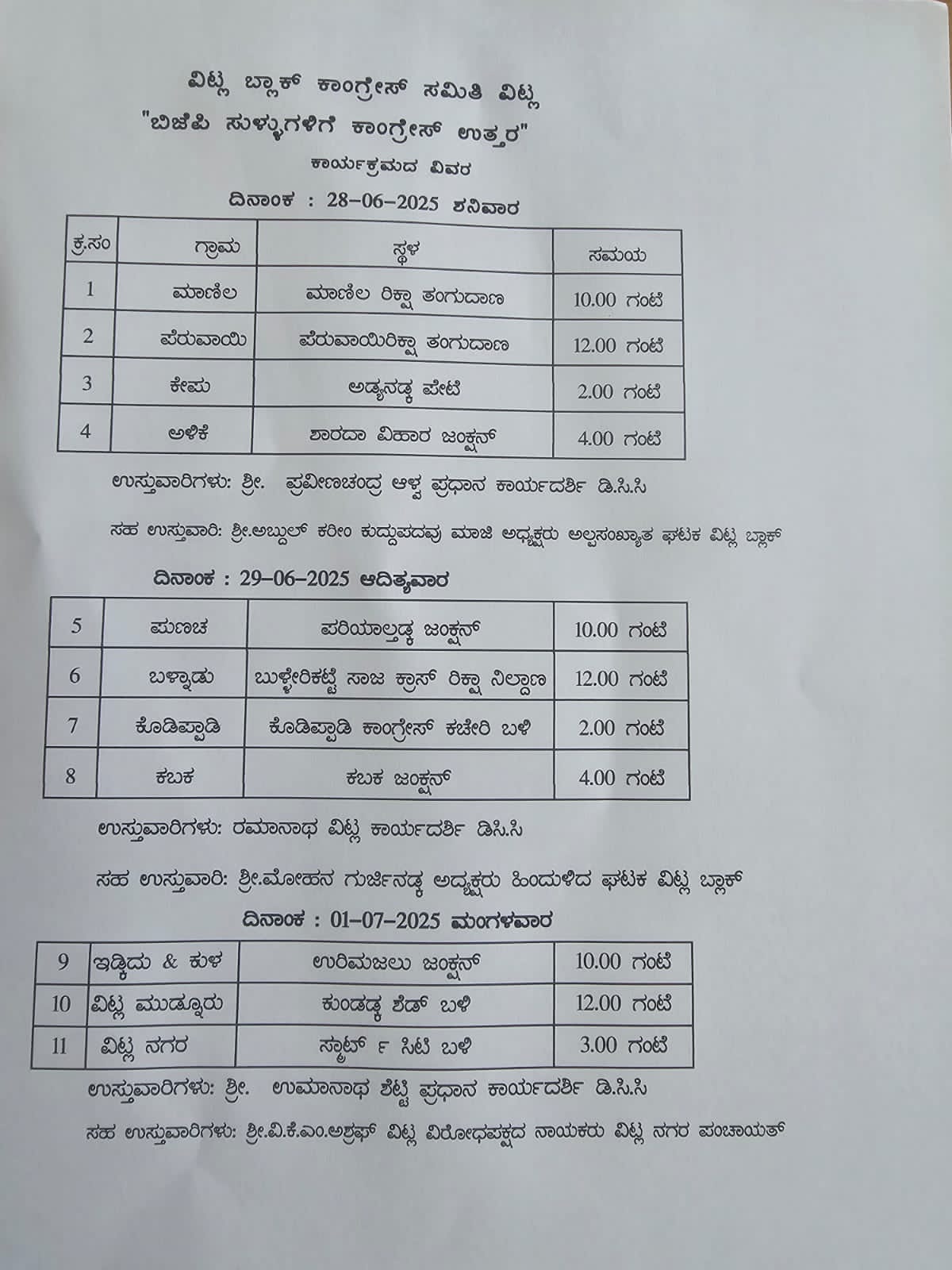 3.ಮಧ್ಯಾಹ್ನ 2.00 ಗಂಟೆಗೆ ಕೇಪು ವಲಯ ಕಾಂಗ್ರೆಸ್ ಆಶ್ರಯದಲ್ಲಿ ಅಡ್ಯನಡ್ಕ ಜಂಕ್ಷನ್ ಬಳಿ.