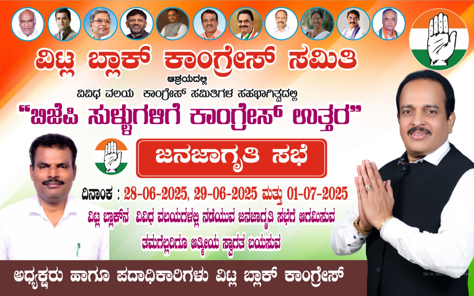 ವಿಟ್ಲ: ವಿಟ್ಲ ಬ್ಲಾಕ್ ಕಾಂಗ್ರೆಸ್ ಮತ್ತು ಮಾಣಿಲ,ಪೆರುವಾಯಿ,ಕೇಪು.ಅಳಿಕೆ ವಲಯ ಕಾಂಗ್ರೆಸ್ ನ ಆಶ್ರಯದಲ್ಲಿ ಪುತ್ತೂರು ವಿಧಾನಸಭಾ ಕ್ಷೇತ್ರದ ಶಾಸಕ ಅಶೋಕ್ ಕುಮಾರ್ ರೈಯವರ ನೇತೃತ್ವದಲ್ಲಿ ಬೃಹತ್ ಕಾಂಗ್ರೆಸ್ ಜನ ಜಾಗೃತಿ ಸಭೆಯು ಜೂ.28 ರಂದು ಈ ಕೆಳಗಿನಂತೆ ನಡೆಯಲಿವೆ.