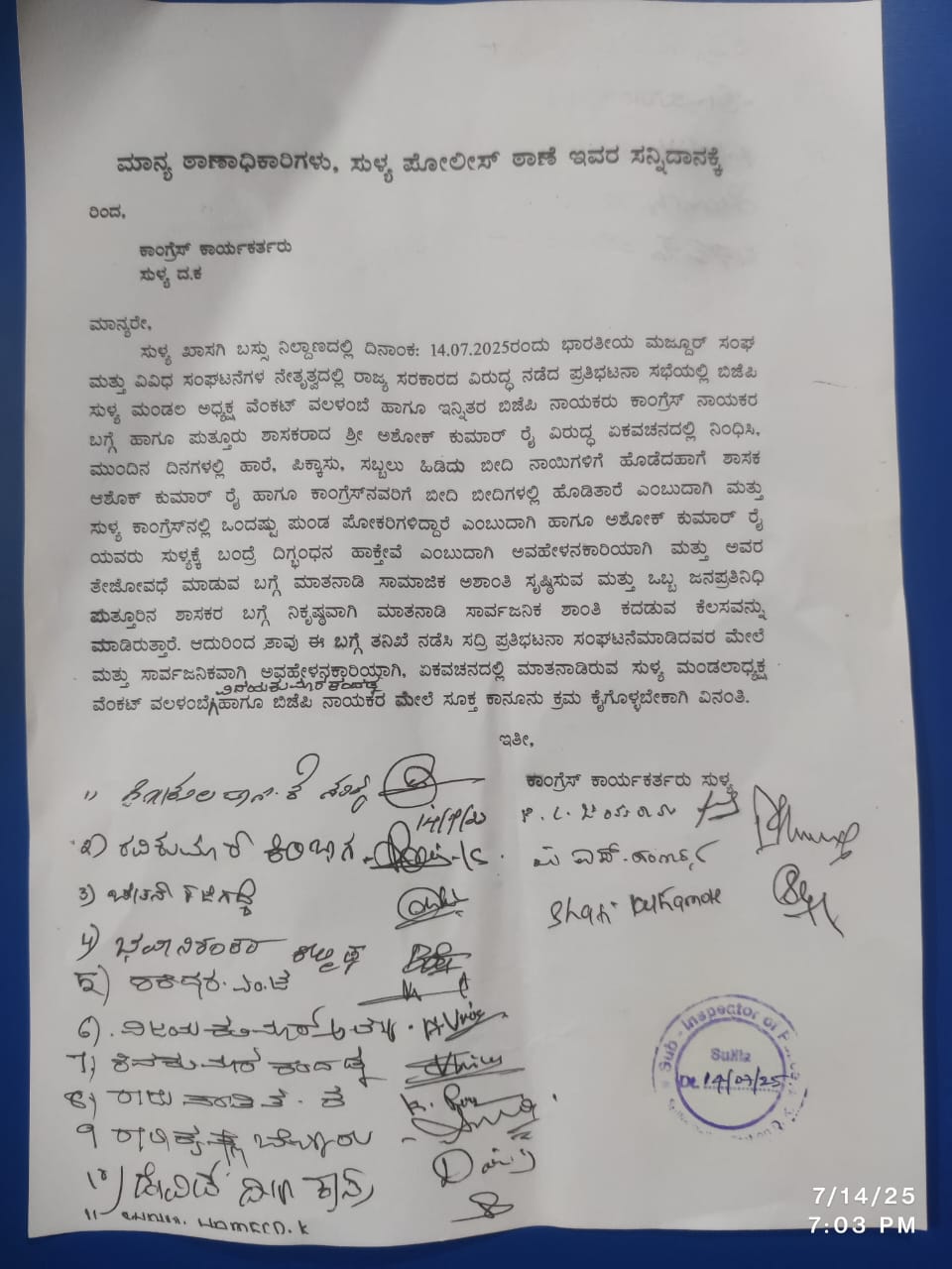 ಸುಳ್ಳ: ಖಾಸಗಿ ಬಸ್ಸು ನಿಲ್ದಾಣದಲ್ಲಿ ದಿನಾಂಕ: 14.07.2025ರಂದು ಧಾರತೀಯ ಮನ್ಸೂರ್ ಸಂಘ ಜಧ ಸಂಘಟನೆಗಳ ನೇತೃತ್ವದಲ್ಲಿ ರಾಜ್ಯ ಸರಕಾರದ ವಿರುದ್ಧ ನಡೆದ ಪ್ರತಿಭಟನಾ ಸಭೆಯಲ್ಲಿ ಬಿಜೆಪಿ ಮಂಡಲ ಅಧ್ಯಕ್ಷ ವೆಂಕಟ್ ವಲಳಂಬೆ ಹಾಗೂ ಇನ್ನಿತರ ಬಿಜೆಪಿ ನಾಯಕರು,ಕಾಂಗ್ರೆಸ್ ನಾಯಕರ ಮತ್ತು ಪುತ್ತೂರು ಶಾಸಕರಾದ ಶ್ರೀ ಅಶೋಕ್ ಕುಮಾರ್ ರೈ ವಿರುದ್ಧ ಏಕವಚನದಲ್ಲಿ ನಿಂಧಿಸಿ ಮತ್ತು ಕಾಂಗ್ರೆಸ್ ನಲ್ಲಿ ಶಾಸಕ ಅಶೋಕ್ ರೈ ಹಾಗೂ ಒಂದಷ್ಟು ಪುಂಡ ಪೋಕರಿಗಳಿದ್ದಾರೆ ಎಂಬುದಾಗಿ ಹಾಗೂ ಅಶೋಕ್ ಕುಮಾರ್ ರೈ ಸುಳ್ಯಕ್ಕೆ ಬಂದ್ರೆ ದಿಗ್ಬಂದನ ಮಾಡುತ್ತೇವೆ ಎಂಬುದಾಗಿ ಅವಹೇಳನಕಾರಿಯಾಗಿ ಮತ್ತು ಸಾಮಾಜಿಕ ಆಶಾಂತಿ ಸೃಷ್ಟಿಸುವ ಮತ್ತು ಏಕವಚನದಲ್ಲಿ ಮಾತನಾಡಿರುವ ಸುಳ್ಯ ಮಂಡಲಾಧ್ಯಕ್ಷ ಹಾಗೂ ಬಿಜೆಪಿ ನಾಯಕರ ಮೇಲೆ ಸೂಕ್ತ ಕಾನೂನು ಕ್ರಮ ಕೈಗೊಳ್ಳಬೇಕಾಗಿ ವಿನಂತಿಸಿದ್ದಾರೆ.