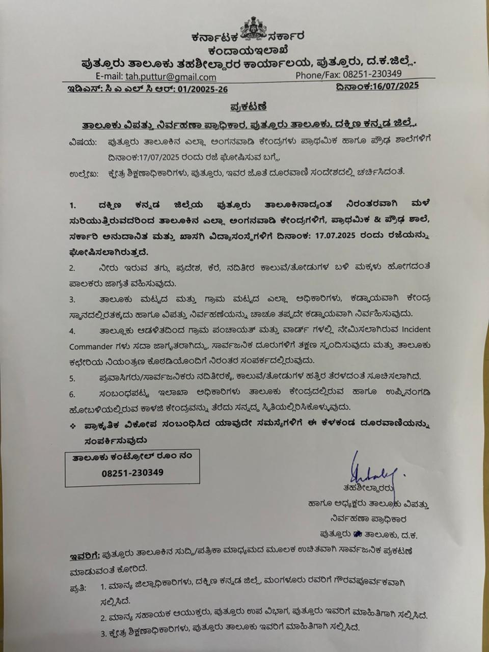 ಬ್ರೇಕಿಂಗ್ ನ್ಯೂಸ್ ಶಾಸಕರ ಸೂಚನೆ ಎಪೆಕ್ಟ್….. ನಾಳೆ (ಜು 17)ಪುತ್ತೂರು ತಾಲೂಕಿನ ಶಾಲೆಗಳಿಗೆ ರಜೆ