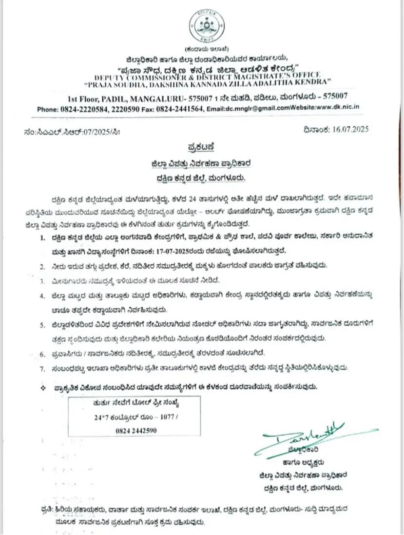ಮಂಗಳೂರು: ದಕ್ಷಿಣ ಕನ್ನಡ ಜಿಲ್ಲೆಯಾದ್ಯಂತ ಬಿರುಸಿನ ಮಳೆಯಾಗುತ್ತಿದ್ದು, ಮುಂಜಾಗ್ರತಾ ಕ್ರಮವಾಗಿ ದಕ್ಷಿಣ ಕನ್ನಡ ಜಿಲ್ಲೆಯ ಎಲ್ಲಾ ಅಂಗನವಾಡಿ, ಪ್ರಾಥಮಿಕ ಮತ್ತು ಪ್ರೌಢ ಶಾಲೆ, ಪದವಿ ಪೂರ್ವ ಕಾಲೇಜು, ಸರಕಾರಿ, ಅನುದಾನಿತ ಮತ್ತು ಖಾಸಗಿ ಶಿಕ್ಷಣ ಸಂಸ್ಥೆಗಳಿಗೆ ಜು.17 ರಂದು ಜಿಲ್ಲಾಡಳಿತ ರಜೆ ಘೋಷಿಸಲಾಗಿದೆ.