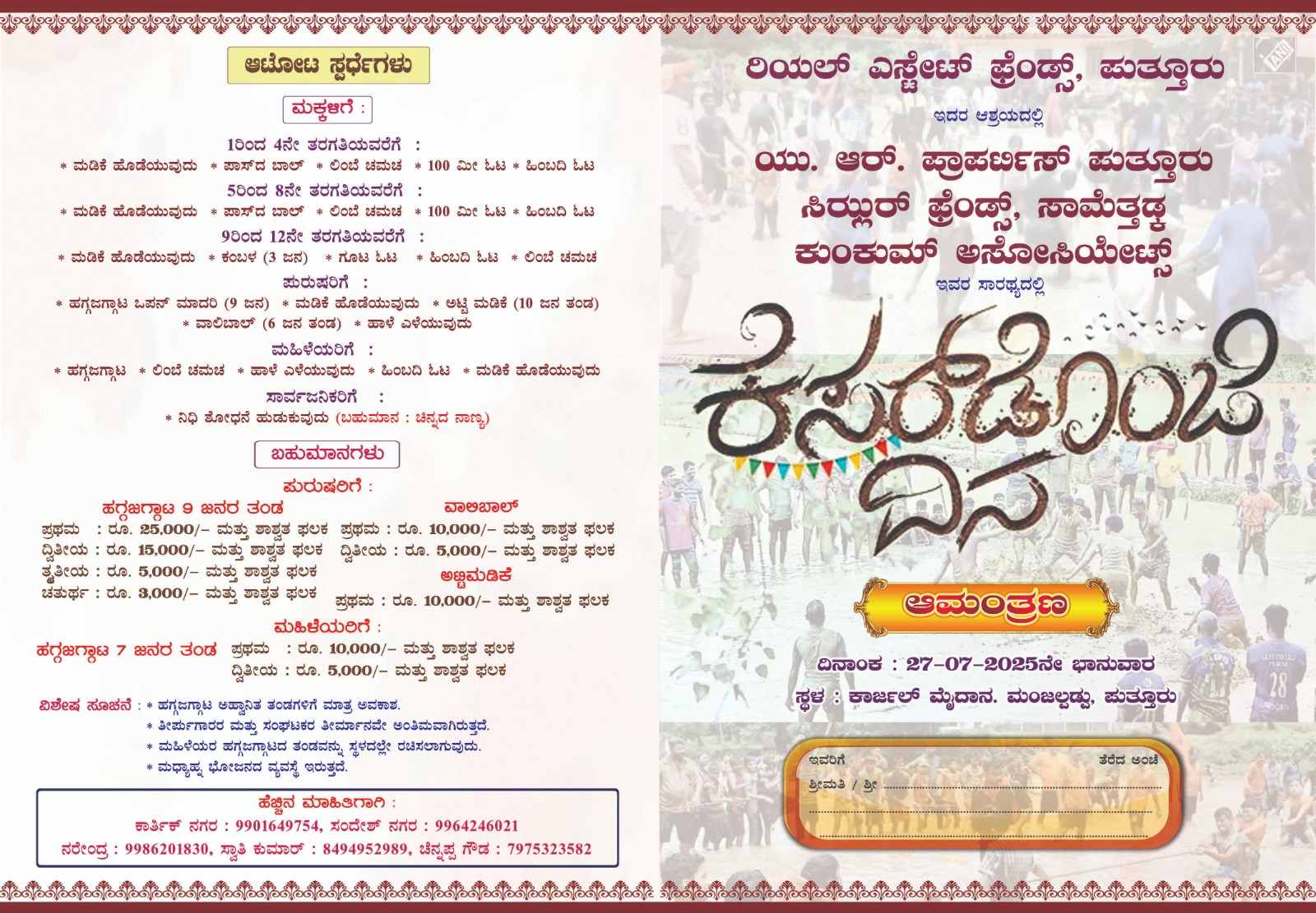 ರಿಯಲ್ ಎಸ್ಟೇಟ್ ಫ್ರೆಂಡ್ಸ್ ಪುತ್ತೂರು ವತಿಯಿಂದ (ಜುಲೈ 27) “ಕೆಸರ್ಡ್ ಒಂಜಿ ದಿನ” ಪೂರ್ವಭಾವಿ ಸಭೆ ಆಮಂತ್ರಣ ಪತ್ರ ಬಿಡುಗಡೆ