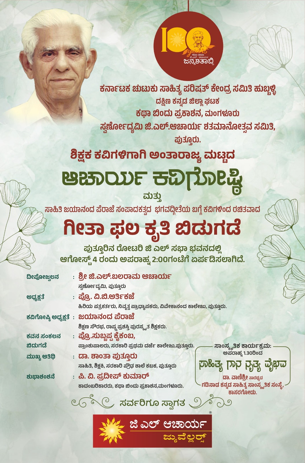 ಪುತ್ತೂರು: ಸ್ವರ್ಣೋದ್ಯಮಿ ಜಿ.ಎಲ್. ಆಚಾರ್ಯರ ಜನ್ಮ ಶತಮಾನೋತ್ಸವದ ಅಂಗವಾಗಿ ಪುತ್ತೂರಿನಲ್ಲಿ ಅಂತಾರಾಜ್ಯ ಮಟ್ಟದ ಶಿಕ್ಷಕ ಕವಿಗಳ “ಆಚಾರ್ಯ ಕವಿಗೋಷ್ಠಿ” ಹಾಗೂ ಗೀತಾ ಫಲ ಕೃತಿ ಬಿಡುಗಡೆ ಸಮಾರಂಭ ಆಗಸ್ಟ್ 4, ಭಾನುವಾರ ಮಧ್ಯಾಹ್ನ 2 ಗಂಟೆಗೆ ಪುತ್ತೂರಿನ ರೋಟರಿ ಜಿ.ಎಲ್. ಸಭಾಭವನದಲ್ಲಿ ನಡೆಯಲಿದೆ.