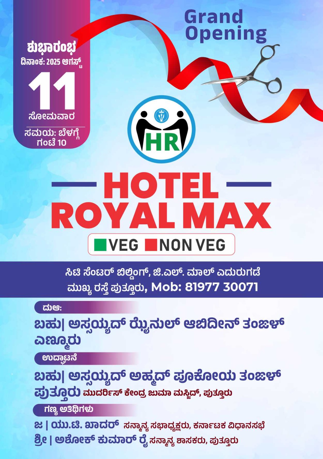 ಸಯ್ಯದ್ ಝನುಲ್ ಆಬಿದೀನ್ ತಂಜಳ್ ಎಣ್ಣೂರು ದುವಾ ನಿರ್ವಹಿಸಲಿದ್ದು ಸಯ್ಯದ್ ಅಹ್ಮದ್ ಪೂಕೋಯ ತಂಬಳ್ ಪುತ್ತೂರು ಹೋಟೆಲ್ನ್ನು ಉದ್ಘಾಟಿಸಲಿದ್ದಾರೆ. ಅತಿಥಿಗಳಾಗಿ ಶಾಸಕ ಅಶೋಕ್ ಕುಮಾರ್ ರೈ, ಮಾಜಿ ಶಾಸಕ ಸಂಜೀವ ಮಠಂದೂರು, ಪುತ್ತೂರು ಶ್ರೀ ಮಹಾಲಿಂಗೇಶ್ವರ ದೇವಸ್ಥಾನದ ವ್ಯವಸ್ಥಾಪನಾ ಸಮಿತಿ ಅಧ್ಯಕ್ಷ ಈಶ್ವರ ಭಟ್ ಪಂಜಿಗುಡ್ಡೆ, ಪುತ್ತೂರು ಚರ್ಚ್ನ ಪ್ರಧಾನ ಧರ್ಮಗುರು ರೆ.ಫಾದರ್ ಲಾರೆನ್ಸ್ ಮಸ್ಕರೇನ್ಹಸ್, ನಗರಸಭೆ ಅಧ್ಯಕ್ಷೆ ಲೀಲಾವತಿ ಅಣ್ಣುನಾಯ್ಕ, ಎಸ್.ಡಿ.ಪಿ.ಐ ರಾಜ್ಯ ಕಾರ್ಯದರ್ಶಿ ರಿಯಾಝ್ ಕಡಂಬು, ಕೆಪಿಸಿಸಿ ಸಂಯೋಜಕ ಕಾವು ಹೇಮನಾಥ ಶೆಟ್ಟಿ, ಪುತ್ತೂರು ನಗರ ಠಾಣೆಯ ಉಪನಿರೀಕ್ಷಕ ಆಂಜನೇಯ ರೆಡ್ಡಿ ಸಹಿತ ಹಲವು ಗಣ್ಯರು ಭಾಗವಹಿಸಲಿದ್ದಾರೆ ಎಂದು ಹೋಟೆಲ್ ರೋಯಲ್ ಮ್ಯಾಕ್ಸ್ನ ಮಾಲಕರು ತಿಳಿಸಿದ್ದಾರೆ.