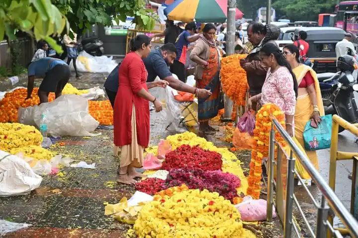 ಹಂಪನಕಟ್ಟೆ ಸುತ್ತಮುತ್ತ ಸೇವಂತಿಗೆ, ಚೆಂಡು ಹೂ, ಗುಲಾಬಿ, ಮಲ್ಲಿಗೆ ಹೂಗಳ ಮಾರಾಟ ಭರದಿಂದ ನಡೆಯಿತು.