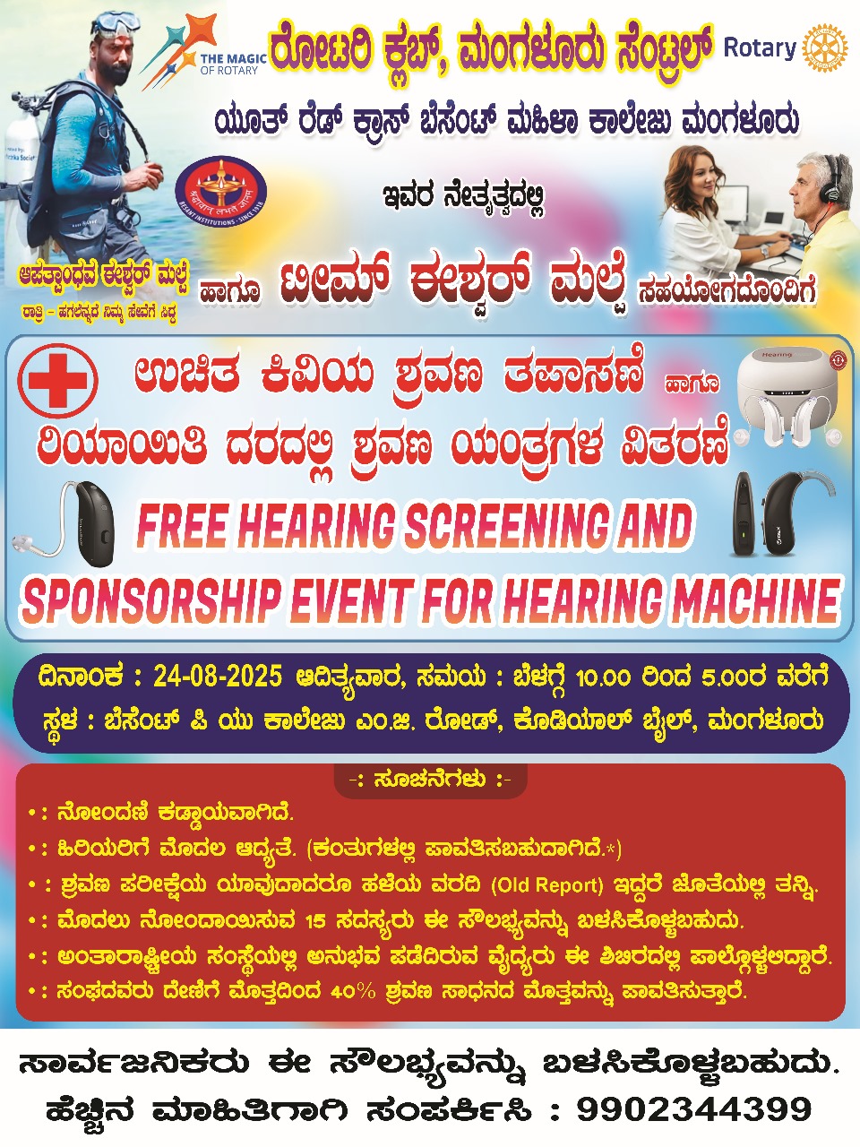 ಮಂಗಳೂರು :ಆ 24 ರಂದು ಉಡುಪಿ ಸಮಾಜ ಸೇವಕ ಈಶ್ವರ್ ಮಲ್ಪೆ ಮತ್ತು ಮಂಗಳೂರು ರೋಟರಿ ಆಫ್ ಸೆಂಟ್ರಲ್ ಉಚಿತ ಶ್ರವಣ ಶಿಬಿರ ಮತ್ತು ಶ್ರವಣ ಸಾಧನಕ್ಕಾಗಿ ಸ್ಪೌನ್ಸರಿಂಗ್ ಕಾರ್ಯಕ್ರಮವನ್ನು