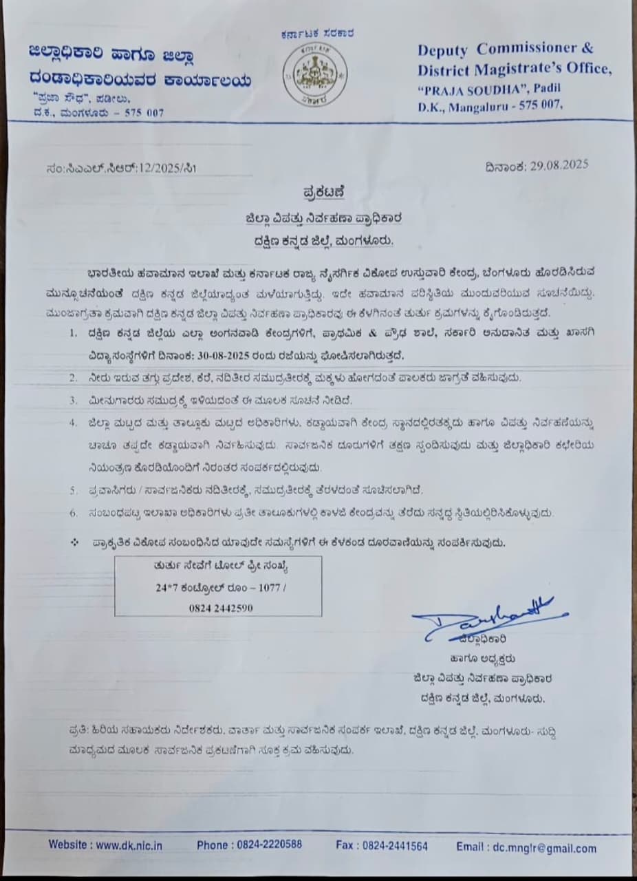 ಭಾರತೀಯ ಹವಾಮಾನ ಇಲಾಖೆ ಮತ್ತು ಕರ್ನಾಟಕ ರಾಜ್ಯ ನೈಸರ್ಗಿಕ ವಿಕೋಪ ಉಸ್ತುವಾರಿ ಕೇಂದ್ರ ಹೊರಡಿಸಿದ ಮುನ್ಸೂಚನೆಯಂತೆ, ಜಿಲ್ಲೆಯಾದ್ಯಂತ ರೆಡ್ ಅಲರ್ಟ್ ಘೋಷಣೆಯಾಗಿದೆ. ಮೀನುಗಾರರು ಸಮುದ್ರಕ್ಕೆ ಇಳಿಯಬಾರದು, ಪ್ರವಾಸಿಗರು, ಸಾರ್ವಜನಿಕರು ನದಿತೀರಕ್ಕೆ ಸಮುದ್ರ ತೀರಕ್ಕೆ ತೆರಳಬಾರದು ಎಂದು ಅವರು ತಿಳಿಸಿದ್ದಾರೆ.