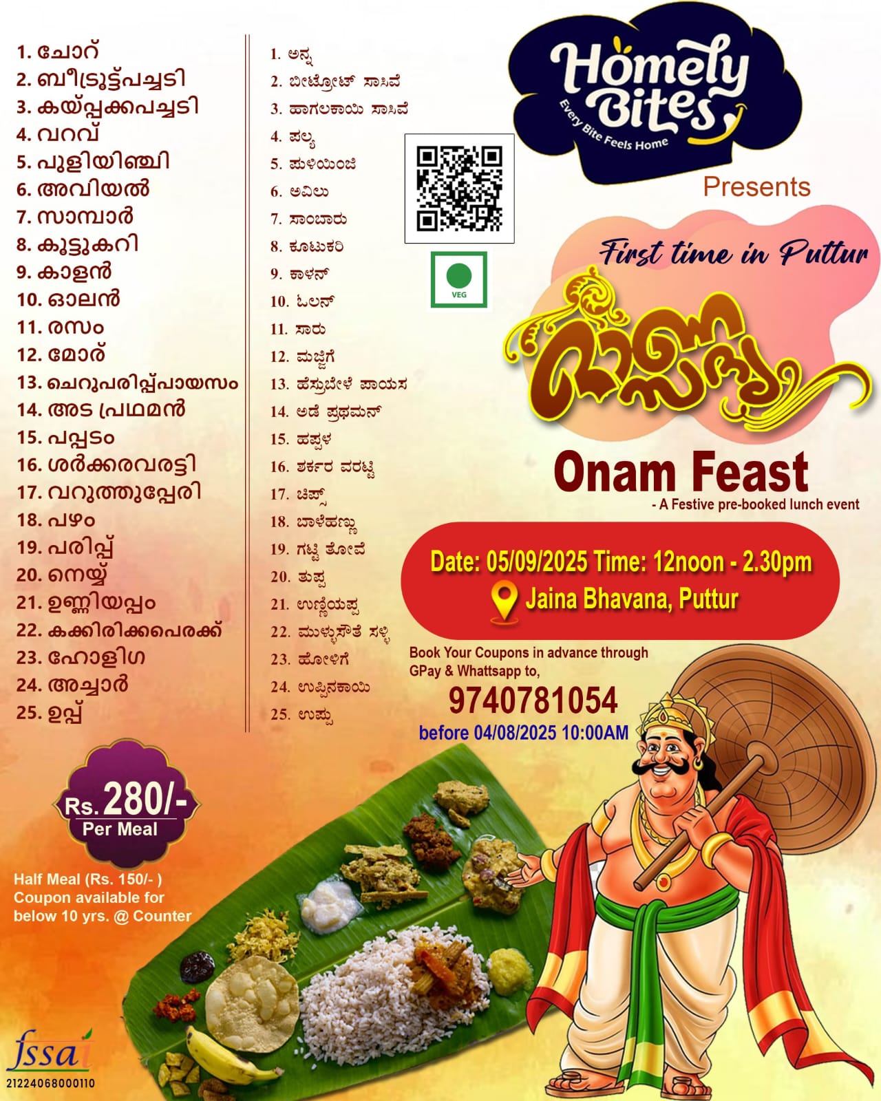 ಮುಂಗಡ ಬುಕ್ಕಿಂಗ್ ಮೂಲಕ ಊಟದ ವ್ಯವಸ್ಥೆ ಆಯೋಜಿಸಲಾಗಿದ್ದು, homelybites.co.in ಎಂಬ ವೆಬ್ಸೈಟ್ ಅಥವಾ ಫೇಸ್ಬುಕ್ ಪೇಜ್ ಲೀ ಕಾದಿರಿಸಿ..
