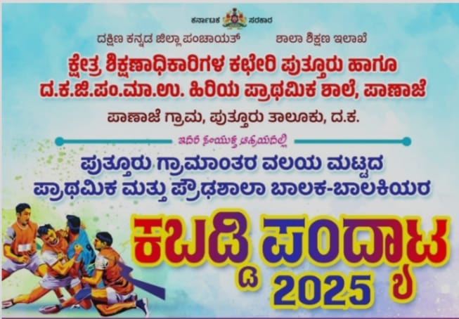 ಪುತ್ತೂರು: ದಕ್ಷಿಣ ಕನ್ನಡ ಜಿಲ್ಲಾ ಪಂಚಾಯತ್ ಶಾಲಾ ಶಿಕ್ಷಣ ಇಲಾಖೆ ಕ್ಷೇತ್ರ ಶಿಕ್ಷಣಾಧಿಕಾರಿಗಳ ಕಛೇರಿ ಪುತ್ತೂರು ಹಾಗೂ ದ.ಕ.ಜಿ.ಪಂ.ಮಾ.ಉ. ಹಿರಿಯ ಪ್ರಾಥಮಿಕ ಶಾಲೆ, ಪಾಣಾಜೆ, ಪಾಣಾಜೆ ಗ್ರಾಮ, ಪುತ್ತೂರು ತಾಲೂಕು, ದ.ಕ., ಇದರ ಆಯುಕ್ತ ಆಶ್ರಯದಲ್ಲಿ ಪುತ್ತೂರು ಗ್ರಾಮಾಂತರ ವಲಯ ಮಟ್ಟದ ಪ್ರಾಥಮಿಕ ಮತ್ತು ಪ್ರೌಢಶಾಲಾ ಬಾಲಕ-ಬಾಲಕಿಯರ ಕಬಡ್ಡಿ ಪಂದ್ಯಾಟ 2025 ದಿನಾಂಕ : 03-09-2025 ಬುಧವಾರ ಸಮಯ : ಪೂರ್ವಾಹ್ನ ಗಂಟೆ 9.00ರಿಂದ ಪಾಣಾಜೆ ಉನ್ನತ ಹಿರಿಯ ಪ್ರಾಥಮಿಕ ಶಾಲಾ ಮೈದಾನದಲ್ಲಿ ನಡೆಯಲಿದೆ.