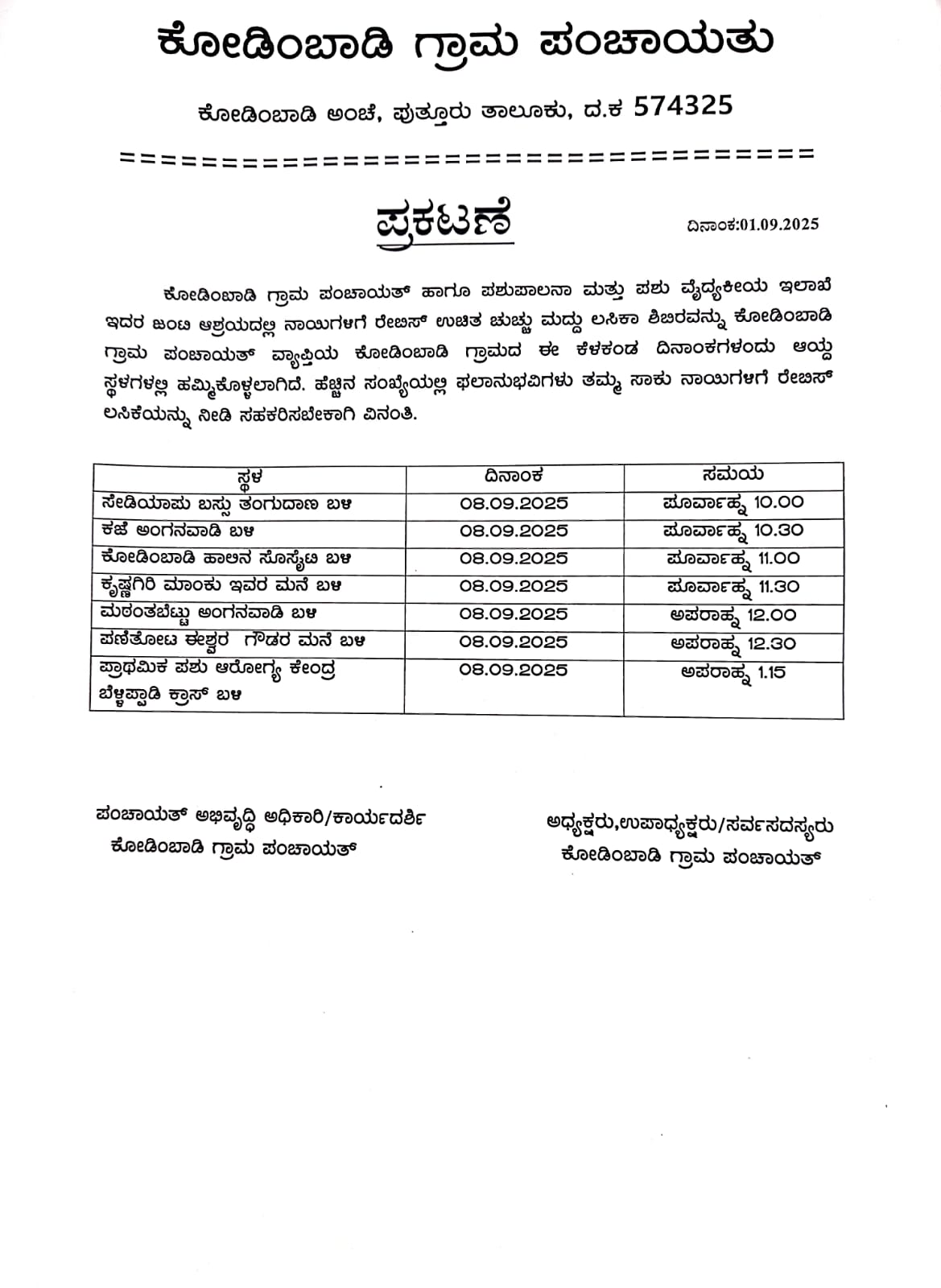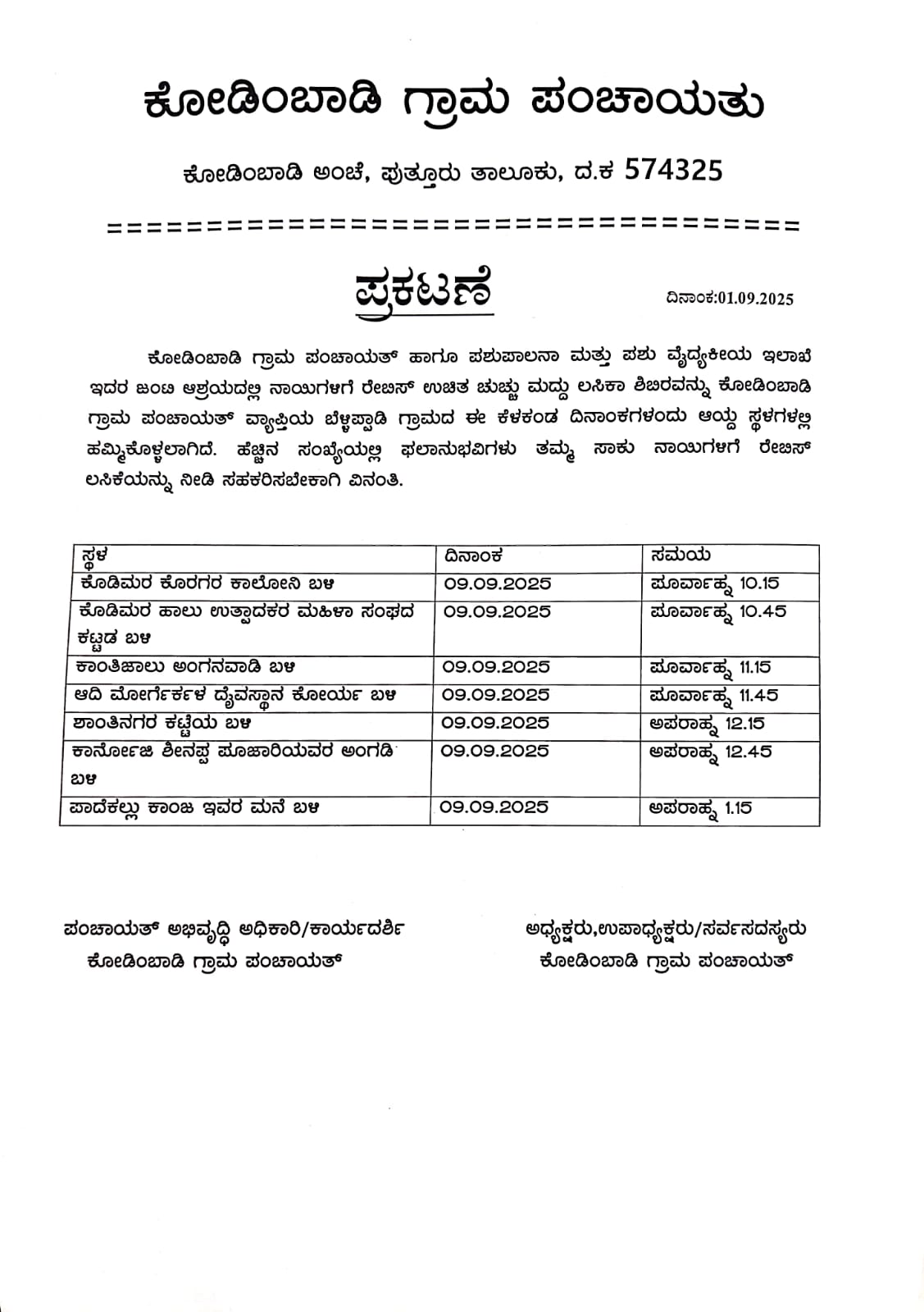 ಪುತ್ತೂರು :ಸೆ 8 ರಂದು ಕೋಡಿಂಬಾಡಿ ಗ್ರಾಮ ಮತ್ತು ಸೆ 9 ರಂದು ಬೆಳ್ಳಿಪ್ಪಾಡಿ ಗ್ರಾಮದಲ್ಲಿ ,ಉಚಿತ ರೇಬಿಸ್ ಲಸಿಕಾ ಶಿಬಿರ ನಡೆಯಲಿದೆ.ಈ ಕೆಳಗಿನಂತೆ ಸಮಯ ನಿಗದಿಪಡಿಸಲಾಗಿದೆ. ಗ್ರಾಮಸ್ಥರು ಇದರ ಸದುಪಯೋಗವನ್ನು ಪಡೆಯುವಂತೆ ವಿನಂತಿಸಲಾಗಿದೆ.