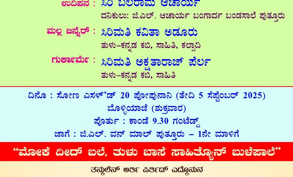 ಪುತ್ತೂರು: ತುಳು ಕೂಟೊ ಪುತ್ತೂರು, ಚಿಗುರೆಲೆ ಸಾಹಿತ್ಯ ಬಳಗ ಪುತ್ತೂರು ವತಿಯಿಂದ ಜಿಎಲ್ ಆಚಾರ್ಯ ಜ್ಯುವೆಲ್ಲರ್ಸ್ ಪ್ರಯೋಜಕತ್ವದಲ್ಲಿ ‘ತುಳು ಕಬಿಕೂಟೊ’ 2025 ಇದೇ ಬರುವ ಸೆ. 5ರಂದು ಪುತ್ತೂರಿನ ಜಿಎಲ್ ಒನ್ ಮಾಲ್ ನ ಮೊದಲನೇ...