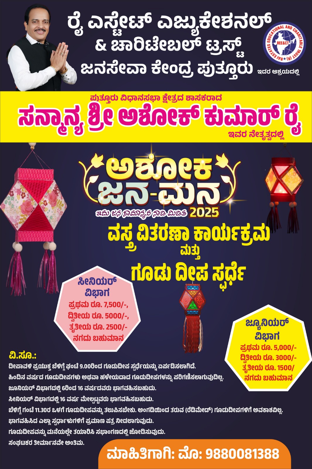 ಪುತ್ತೂರು : ಅ 20 ರಂದು ಪುತ್ತೂರಿನ ಕೊಂಬೆಟ್ಟು ಕ್ರೀಡಾಂಗಣದಲ್ಲಿ ನಡೆಯುವ “ಅಶೋಕ ಜನ-ಮನ 2025” ವಸ್ತ್ರ ವಿತರಣೆ ಕಾರ್ಯಕ್ರಮ ದಲ್ಲಿ ಗೂಡು ದೀಪ ಸ್ಪರ್ಧೆ ಯನ್ನು ಆಯೋಜಿಸಲಾಗಿದೆ.