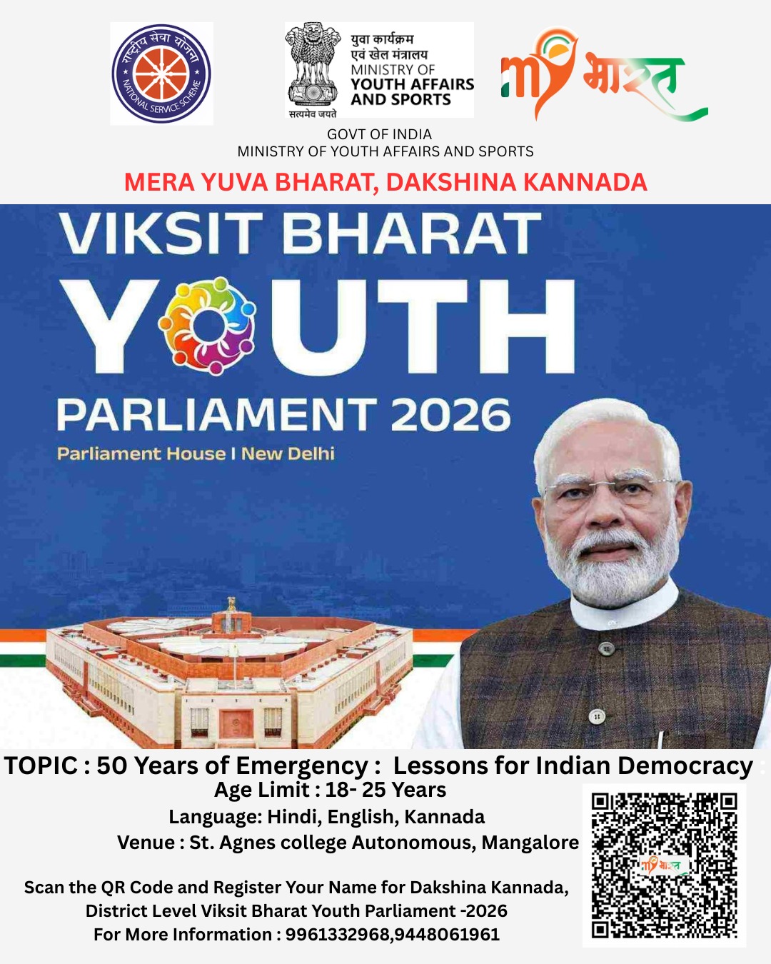 ಮಂಗಳೂರು, ಅಕ್ಟೋಬರ್ 8, 2025: ಭಾರತ ಸರ್ಕಾರದ ಯುವ ವ್ಯವಹಾರ ಮತ್ತು ಕ್ರೀಡಾ ಸಚಿವಾಲಯದ ಪ್ರಮುಖ ಉಪಕ್ರಮವಾದ ವಿಕಸಿತ ಭಾರತ ಯುವ ಸಂಸತ್ 2026 ಆರಂಭಗೊಂಡಿದ್ದು, 18 ರಿಂದ 25 ವರ್ಷ ವಯಸ್ಸಿನ ಯುವಕ-ಯುವತಿಯರಿಗೆ ನೋಂದಣಿಗೆ ಕರೆ ನೀಡಲಾಗಿದೆ. ಈ ಸ್ಪರ್ಧೆಯಲ್ಲಿ ಭಾಗವಹಿಸುವವರು ಹಿಂದಿ, ಇಂಗ್ಲಿಷ್ ಅಥವಾ ಕನ್ನಡ ಭಾಷೆಯಲ್ಲಿ ನಿಗದಿತ ಸಮಯದೊಳಗೆ ತಮ್ಮ ಭಾಷಣವನ್ನು ಮಂಡಿಸಬಹುದು.