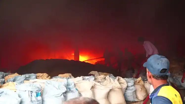 ಸಂಜೆ ವೇಳೆ ಗೋದಾಮಿನ ಒಳಗೆ ಕಾಣಿಸಿಕೊಂಡ ಬೆಂಕಿ ಒಮ್ಮಿಂದೊಮ್ಮೆಲೇ ಸುತ್ತಲೂ ವ್ಯಾಪಿಸಿತು.