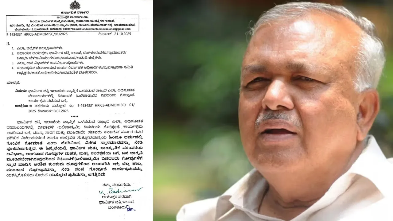 ಧಾರ್ಮಿಕ ದತ್ತಿ ಇಲಾಖೆಯ ವ್ಯಾಪ್ತಿಗೆ ಒಳಪಡುವ ದೇವಾಲಯಗಳಲ್ಲಿ ಗೋಪೂಜೆ ನಡೆಸುವಂತೆ ಮುಜರಾಯಿ ಇಲಾಖೆ ಸೂಚನೆ ನೀಡಿದೆ. ರಾಜ್ಯದ ಎಲ್ಲಾ ಅಧಿಸೂಚಿತ ದೇವಾಲಯಗಳಲ್ಲಿ ದೀಪಾವಳಿ (ಬಲಿಪಾಡ್ಯಮಿ) ದಿನದಂದು ಗೋಪೂಜೆ ಕಾರ್ಯಕ್ರಮ ನಡೆಸಲು ಸುತ್ತೋಲೆ ಹೊರಡಿಸಲಾಗಿದೆ. ಹಿಂದೂ ಧರ್ಮದಲ್ಲಿ ಗೋವಿಗೆ ಗೋಮಾತೆ ಎಂಬ ಹೆಸರಿನಿಂದ, ವಿಶೇಷ ಸ್ಥಾನಮಾನವನ್ನು ನೀಡಿ ಪೂಜಿಸಲಾಗುತ್ತಿದೆ . ಈ ಹಿನ್ನೆಲೆಯಲ್ಲಿ ಧಾರ್ಮಿಕ ಮತ್ತು ಸಾಂಸ್ಕೃತಿಕ ಪರಂಪರೆಯ ಅವಿಭಾಜ್ಯ ಅಂಗವಾದ ಗೋವುಗಳ ಮಹತ್ವ ಮತ್ತು ಸಂರಕ್ಷಣೆಯ ಬಗ್ಗೆ, ಜನ ಜಾಗೃತಿ ಮೂಡಿಸಬೇಕಾಗಿದೆ.