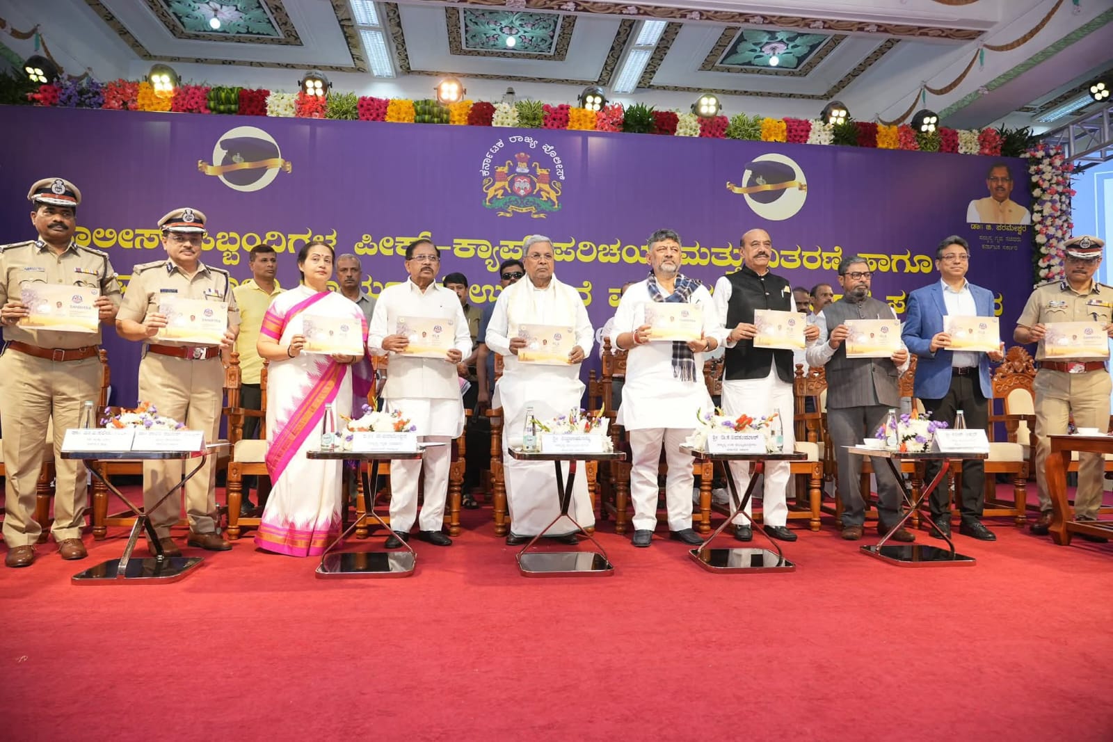 ಬೆಂಗಳೂರು : ಕರ್ನಾಟಕ ರಾಜ್ಯ ಪೊಲೀಸ್ ಸಿಬ್ಬಂದಿಯ ಪೀಕ್ ಕ್ಯಾಪ್ ವಿತರಣೆ ಹಾಗೂ ಮಾದಕ ದ್ರವ್ಯ ವಿರೋಧಿ ಕಾರ್ಯಪಡೆ ಉದ್ಘಾಟನೆ ಮತ್ತು ಸನ್ಮಿತ್ರ ಕೈಪಿಡಿ ಬಿಡುಗಡೆ ಕಾರ್ಯಕ್ರಮದಲ್ಲಿ ಸಿಎಂ ಸಿದ್ದರಾಮಯ್ಯ ಉಪಮುಖ್ಯಮಂತ್ರಿ ಡಿಕೆ ಶಿವಕುಮಾರ್ ಹಾಗೂ ಗೃಹಸಚಿವರಾದ ಜಿ.ಪರಮೇಶ್ವರ್ ಭಾಗವಹಿಸಿದರು. ಈ ವೇಳೆ ಹಳೇ ಕಾಲದ ಸ್ಲೋಚ್ ಹ್ಯಾಟ್ಗೆ ವಿದಾಯ ಹೇಳಿ ಪೊಲೀಸ್ ಸಿಬ್ಬಂದಿಗೆ ಹೊಸ ಪೀಕ್ ಕ್ಯಾಪ್ ವಿತರಣೆ ಮಾಡಲಾಯಿತು.