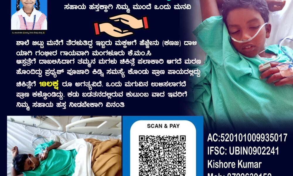 ಶಾಲೆ ಬಿಟ್ಟು ಮನೆಗೆ ತೆರಳುತ್ತಿದ್ದ ಇಬ್ಬರು ಮಕ್ಕಳಿಗೆ ಹೆಚ್ಚೇನು (ಕಣಜ) ದಾಳಿ ಯಾಗಿ ಗಂಭೀರ ಗಾಯವಾಗಿ ಮಂಗಳೂರು ಕೆ.ಮಂ.ಸಿ ಆಸ್ಪತ್ರೆಗೆ ದಾಖಲಿಸಿದಾಗ,ತಮ್ಮನ ಮಗಳು ಚಿಕಿತ್ಸೆ ಪಲಾಕಾರಿ ಆಗದೆ ಮರಣ ಹೊಂದಿದ್ದು ಪ್ರಥ್ಯಶ್ ಪೂಜಾರಿ ಕಿಡ್ನಿ ಸಮಸ್ಯೆ...