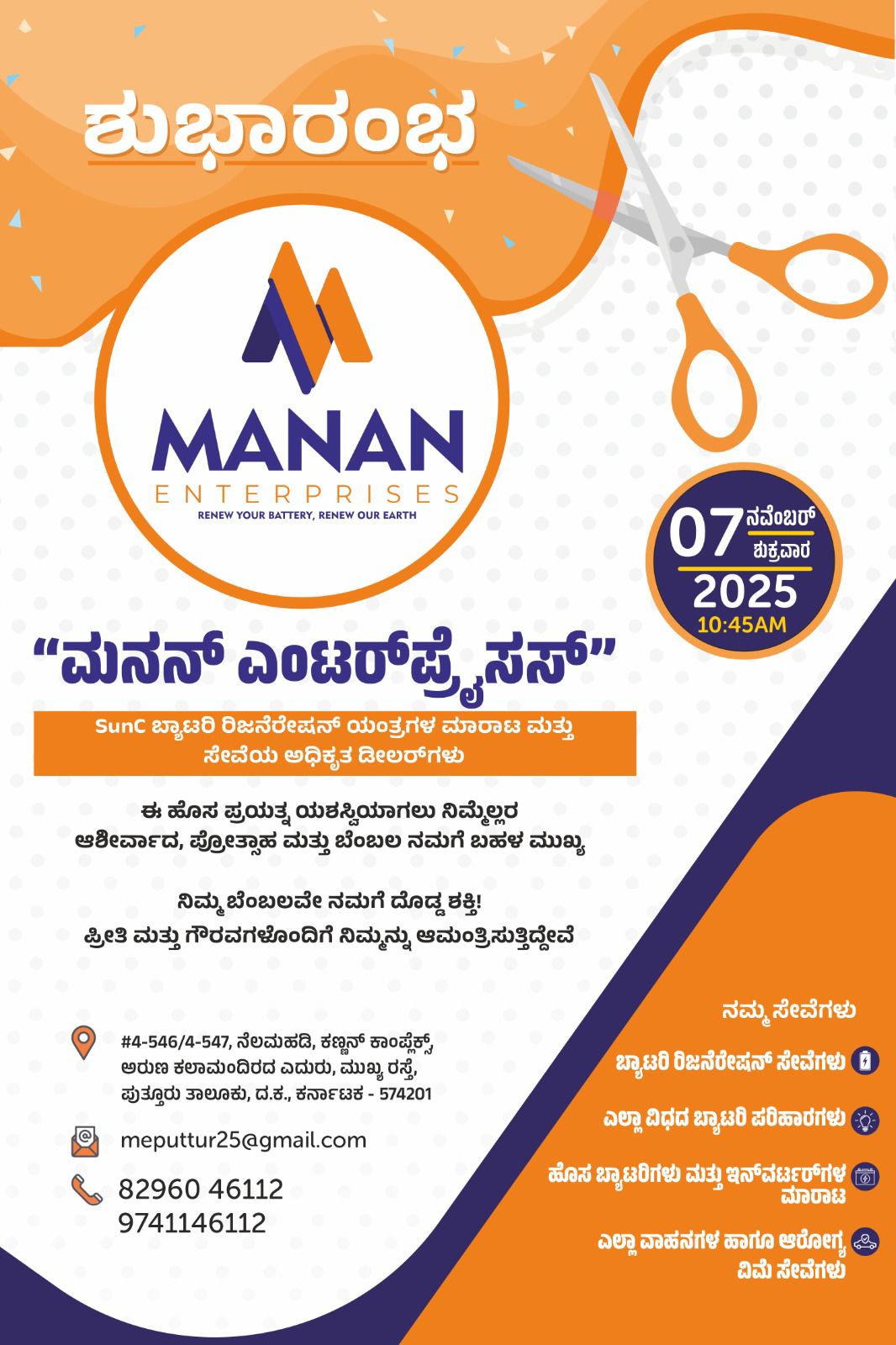 ಪುತ್ತೂರು : ನ.06 ಪುತ್ತೂರಿನ ಹೃದಯ ಭಾಗವಾದ ಅರುಣ ಕಾಲಮಂದಿರದ ಎದುರಿನ ಕಣ್ಣನ್ ಕಾಂಪ್ಲೆಕ್ಸ್ ನಲ್ಲಿ ನಾಳೆ ಬೆಳಿಗ್ಗೆ 10.45ಗೆ ಮಾನನ್ ಎಂಟರ್ ಪ್ರೈಸಸ್ ಉದ್ಘಾಟನೆ ನಡೆಯಲಿದೆ. ತಮ್ಮೆಲ್ಲರನ್ನು ಪ್ರೀತಿ ಪೂರ್ವಕವಾಗಿ ಸ್ವಾಗತಿಸುತ್ತೇವೆ ಎಂದು ಸಂಸ್ಥೆಯ ಮಾಲಕರಾದ ಅರ್ಜುನ್ ತಿಳಿಸಿರುತ್ತಾರೆ.