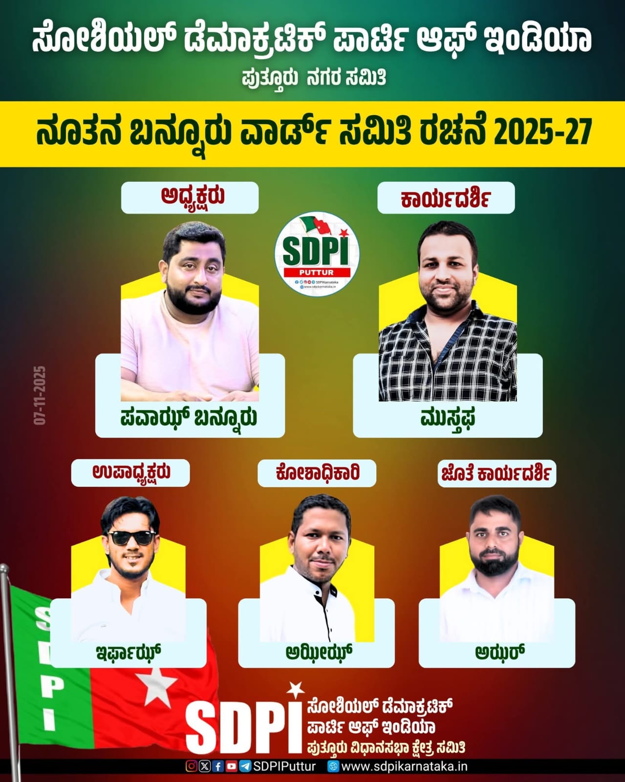 ಪುತ್ತೂರು :- ಸೋಶಿಯಲ್ ಡೆಮಾಕ್ರಟಿಕ್ ಪಾರ್ಟಿ ಆಫ್ ಇಂಡಿಯಾ ಬನ್ನೂರು ನೂತನ ವಾರ್ಡ್ ಸಮಿತಿಯನ್ನು ರಚಿಸಿ ಪದಾಧಿಕಾರಿಗಳ ಆಯ್ಕೆ ನಡೆಯಿತು. ಅಧ್ಯಕ್ಷರಾಗಿ ಪವಾಝ್ ಪಾಪ್ಲಿ ಬನ್ನೂರು ಕಾರ್ಯದರ್ಶಿಯಾಗಿ ಮುಸ್ತಫ, ಉಪಾಧ್ಯಕ್ಷರಾಗಿ ಇರ್ಫಾಝ್, ಕೋಶಾಧಿಕಾರಿಯಾಗಿ ಅಝೀಝ್ ಮತ್ತು ಜೊತೆ ಕಾರ್ಯದರ್ಶಿಯಾಗಿ ಅಝರ್ ಆಯ್ಕೆಯಾದರು.