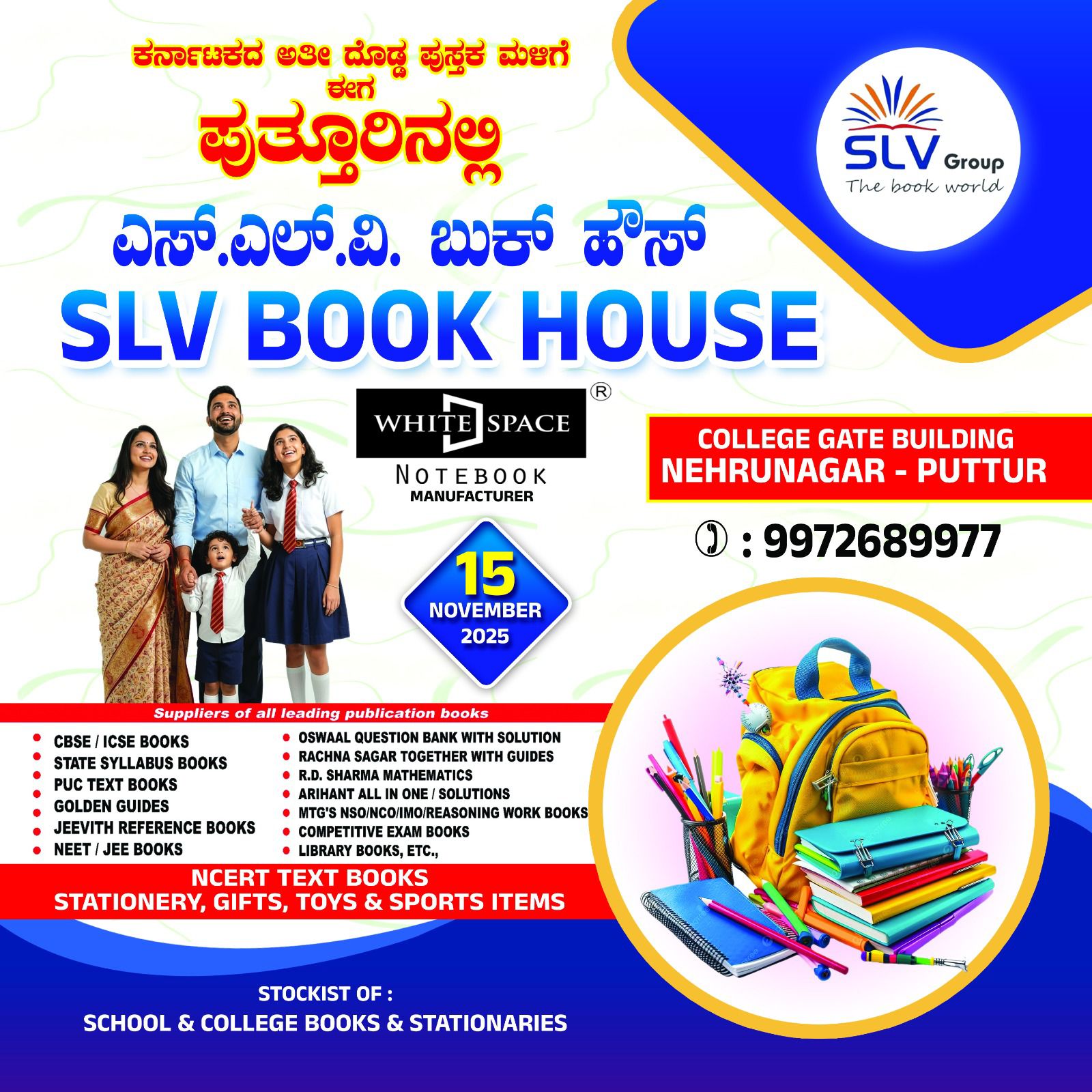 ನವೆಂಬರ್ 15 ರಂದು ಪುತ್ತೂರು ನೆಹರೂ ನಗರದಲ್ಲಿರುವ ಕಾಲೇಜು ಕಟ್ಟಡದಲ್ಲಿ ಶುಭಾರಂಭಗೊಳ್ಳುತ್ತಿರುವ ಎಸ್ ಎಲ್ ವಿ ಬುಕ್ ಹೌಸ್ ನ ಕಾರ್ಯಕ್ರಮಕ್ಕೆ ಎಸ್ ಎಲ್ ವಿ ಗ್ರೂಪ್ಸ್ ಮಾಲಕರಾದ ಶ್ರೀ ದಿವಾಕರ್ ದಾಸ್ ನೇರ್ಲಾಜೆ ಮತ್ತು ಹೇಮಾವತಿ ದಿವಾಕರ್ ದಾಸ್ ನೇರ್ಲಾಜೆ ರವರು, ಹಾಗೂ ಆಡಳಿತ ಮಂಡಳಿ ಮತ್ತು ಸಿಬ್ಬಂದಿ ವರ್ಗ ಸರ್ವರನ್ನೂ ಆಮಂತ್ರಿಸಿದ್ದಾರೆ ಎಂದು ಪ್ರಕಟಣೆಯಲ್ಲಿ ತಿಳಿಸಿದ್ದಾರೆ.