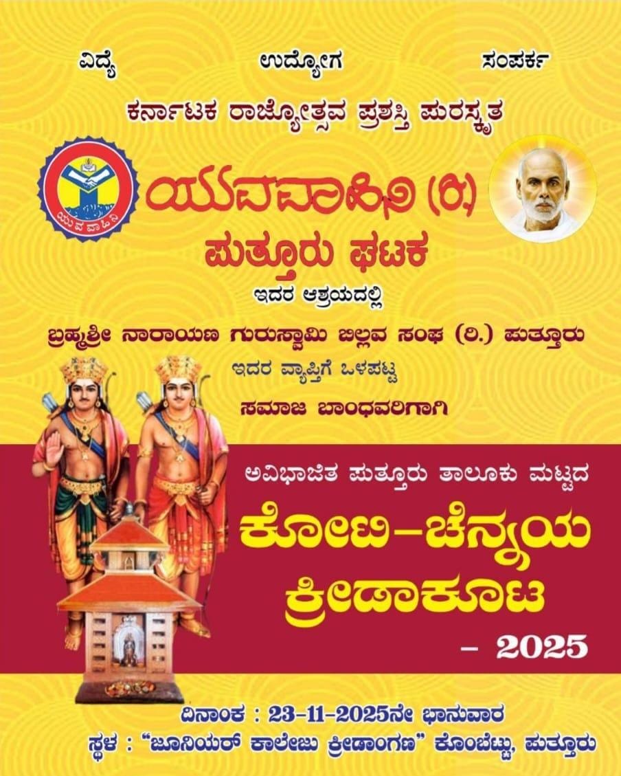ಸಮಾಜ ಬಾಂಧವರಿಗಾಗಿ ಅವಿಭಾಜಿತ ಪುತ್ತೂರು ತಾಲೂಕು ಮಟ್ಟದ ಕೋಟಿ-ಚೆನ್ನಯ ಕ್ರೀಡಾಕೂಟ 2025 ಸ್ಥಳ “ಜೂನಿಯರ್ ಕಾಲೇಜು ಕ್ರೀಡಾಂಗಣ” ಕೊಂಬೆಟ್ಟು ಪುತ್ತೂರುನಲ್ಲಿ ನಡೆಯಲಿದೆ. ಬೆಳಿಗ್ಗೆ ಗಂಟೆ 8:30ಕ್ಕೆ ಉದ್ಘಾಟನೆಗೊಂಡು ಸಂಜೆ ಸಮಾರೋಪ ಸಮಾರಂಭ ನಡೆಯಲಿದೆ ಸಮಾಜ ಬಾಂಧವರು ಹೆಚ್ಚಿನ ಸಂಖ್ಯೆಯಲ್ಲಿ ಭಾಗವಹಿಸಿ ಈ ಕಾರ್ಯಕ್ರಮವನ್ನು ಯಶಸ್ವಿಗೊಳಿಸಬೇಕೆಂದು ಪುತ್ತೂರು ಘಟಕದ ಅಧ್ಯಕ್ಷರಾದ ಅಣ್ಣಿ ಪೂಜಾರಿ ತಿಳಿಸಿರುತ್ತಾರೆ