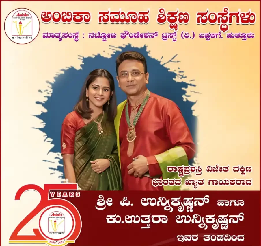 ಪುತ್ತೂರು: ಬಪ್ಪಳಿಗೆಯ ನಟ್ಟೋಜ ಫೌಂಡೇಶನ್ ಟ್ರಸ್ಟ್ (ರಿ.) ಪ್ರವರ್ತಿತ ಅಂಬಿಕಾ ಸಮೂಹ ಶಿಕ್ಷಣ ಸಂಸ್ಥೆಗಳ 25ನೇ ವರ್ಷದ ರಜತ ಮಹೋತ್ಸವದ ಪ್ರಯುಕ್ತ ಡಿಸೆಂಬರ್ 13ರಂದು ವಿಶೇಷ ಕರ್ನಾಟಕ ಶಾಸ್ತ್ರೀಯ ಸಂಗೀತ ಕಾರ್ಯಕ್ರಮವನ್ನು ಆಯೋಜಿಸಲಾಗಿದೆ ಎಂದು ಸಂಸ್ಥೆಯ ಪ್ರಕಟಣೆ ತಿಳಿಸಿದೆ.