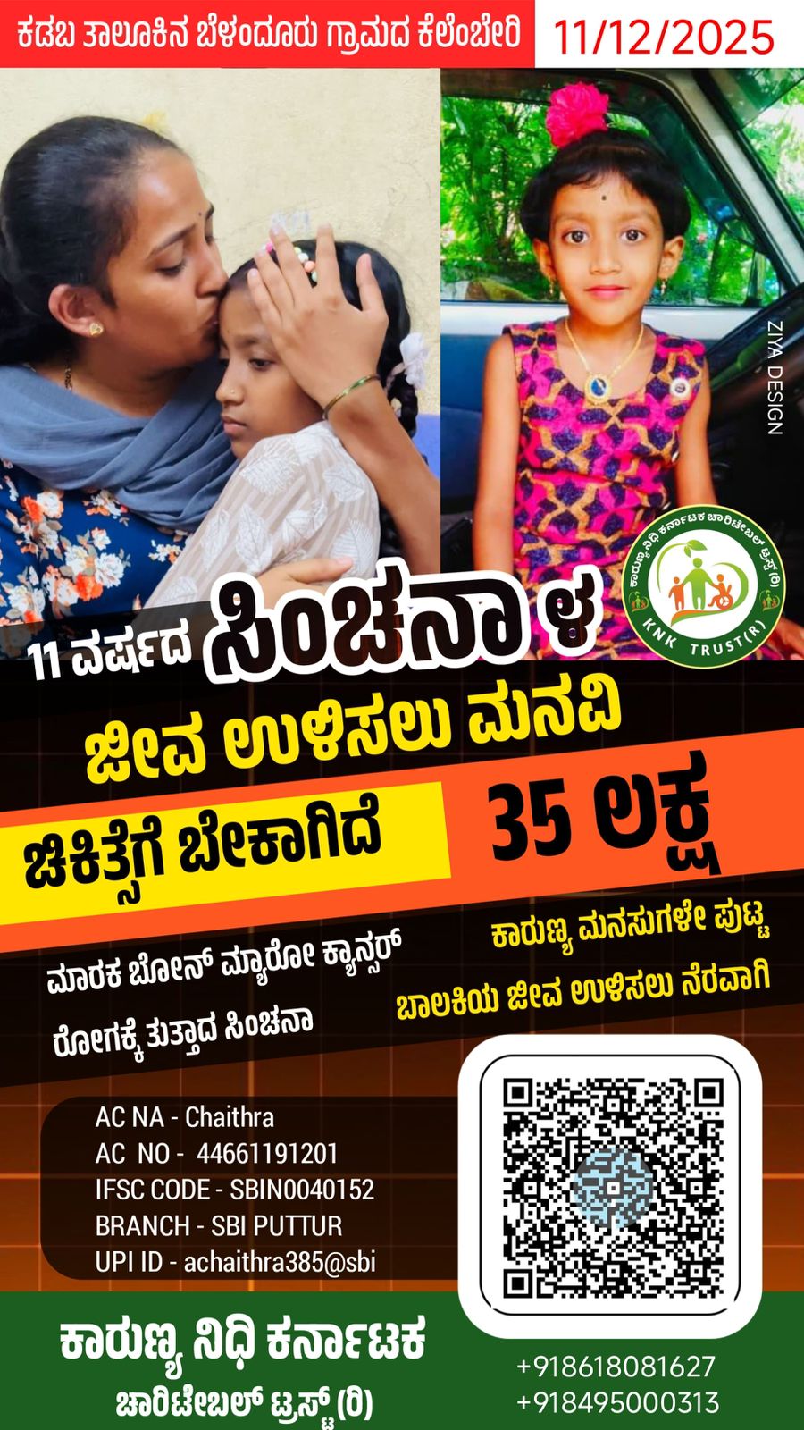 ಕಡಬ ತಾಲೂಕಿನ ಬೆಳಂದೂರು ಗ್ರಾಮದ ಕೆಲೆಂಬೇರಿ ನಿವಾಸಿ ನಿರ್ಮಲಾ ಕುಮಾರ್ ಹಾಗೂ ಚೈತ್ರಾ ದಂಪತಿಗಳ ಹನ್ನೊಂದು ವರ್ಷದ ಪುಟ್ಟ ಬಾಲಕಿ ಸಿಂಚನಾ ಮಾರಕ ಬೋನ್ ಮ್ಯಾರೋ ಕ್ಯಾನ್ಸರ್ ರೋಗಕ್ಕೆ ತುತ್ತಾಗಿದ್ದು ವೈದ್ಯರ ಸಲಹೆ ಪ್ರಕಾರ ಚಿಕಿತ್ಸೆಗೆ 35 ಲಕ್ಷ ಬೇಕಾಗಿದೆ. ಆರ್ಥಿಕವಾಗಿ ತೀರಾ ಹಿಂದುಳಿದ ಸಿಂಚನಾಳ ಕುಟುಂಬ ಕಾರುಣ್ಯ ನಿಧಿ ಕರ್ನಾಟಕ ಚಾರಿಟೇಬಲ್ ಟ್ರಸ್ಟ್ (ರಿ) ಊರಿನ ಸರ್ವಧರ್ಮೀಯರ ಮುಖಾಂತರ ಸಾರ್ವಜನಿಕವಾಗಿ ಸಹಾಯದ ಬೇಡಿಕೆಯನ್ನಿಟ್ಟಿದ್ದೇವೆ ಉದಾರ ಮನಸಿನ ದಾನಿಗಳು ತಮ್ಮ ಕೈಯ್ಯಲ್ಲಾಗುವಷ್ಟು ಸಹಾಯ ಮಾಡುವ ಮುಖಾಂತರ ಈ ಕೆಳಗಿನ ವಿಡಿಯೋ ಪೋಸ್ಟರ್ಗಳನ್ನ ಆದಷ್ಟು ಶೇರ್ ಮಾಡಿ ಸಹಕರಿಸಿ
