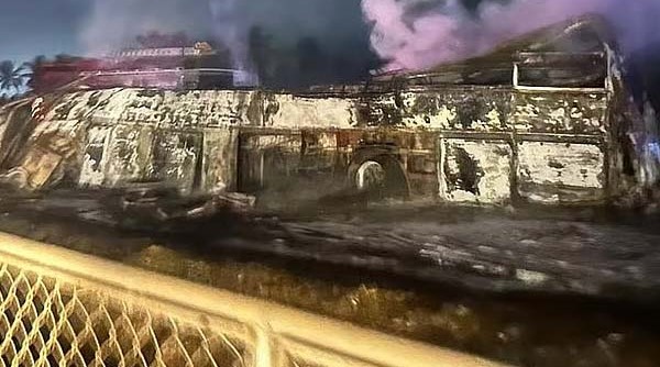 ಡಿಕ್ಕಿ ಬಳಿಕ ಕಂಟೇನರ್ ಲಾರಿ ಹಾಗೂ ಬಸ್ ಎರಡೂ ಬೆಂಕಿ ಹೊತ್ತಿಕೊಂಡಿದ್ದು, ಬಸ್ ಸಂಪೂರ್ಣವಾಗಿ ಸುಟ್ಟುಕರಕಲಾಗಿದೆ.