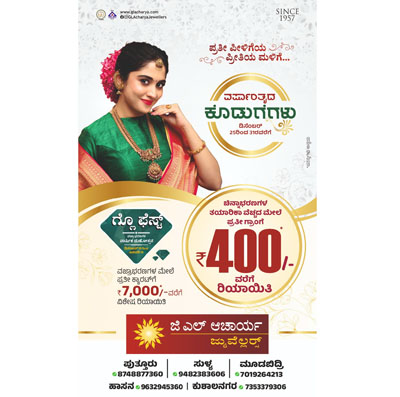 ಪುತ್ತೂರು: ಮುಖ್ಯ ರಸ್ತೆಯಲ್ಲಿರುವ ಪ್ರತಿಷ್ಠಿತ ಜಿನ್ನಾಭರಣಗಳ ಮಳಿಗೆ ಜಿಎಲ್ ಆಚಾರ್ಯ ಜ್ಯುವೆಲ್ಲರ್ಸ್ ತನ್ನ ಗ್ರಾಹಕರಿಗೆ ವರ್ಷಾಂತ್ಯದ ಕೊಡುಗೆಗಳನ್ನು ಘೋಷಿಸಿದೆ.