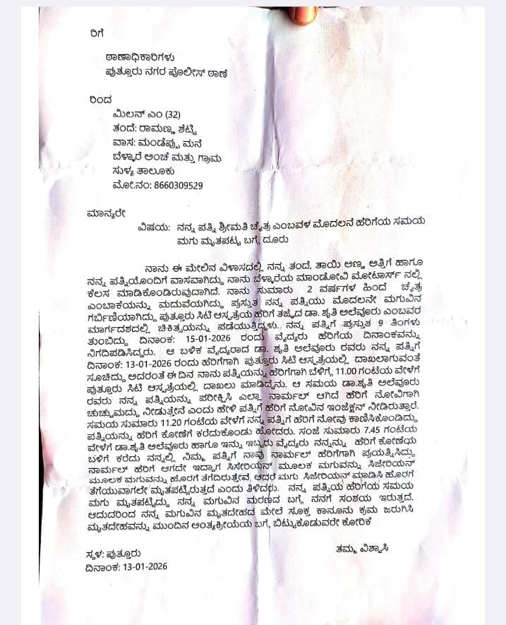 ಬೆಳ್ಳಾರೆ ಗ್ರಾಮದ ಮಿಲನ್ ಎಂಬವರ ಪತ್ನಿ ಚೈತ್ರ ಅವರು ಮೊದಲನೆ ಮಗುವಿನ ಗರ್ಭಿಣಿಯಾಗಿದ್ದು, ಪುತ್ತೂರು ಸಿಟಿ ಆಸ್ಪತ್ರೆಯ ಹೆರಿಗೆ ತಜ್ಞೆ ಡಾ. ಕೃತಿ ಎಂಬವರ ಮಾರ್ಗದರ್ಶನದಲ್ಲಿ ಚಿಕಿತ್ಸೆ ಪಡೆಯುತ್ತಿದ್ದರು. ವೈದ್ಯರು ಜ.15ರಂದು ಹೆರಿಗೆ ದಿನಾಂಕ ನಿಗದಿಪಡಿಸಿದ್ದರು. ಆದರೆ ಜ.13ಕ್ಕೆ ಆಸ್ಪತ್ರೆಗೆ ದಾಖಲಾಗುವಂತೆ ಸೂಚಿಸಿದ್ದು, ಅದರಂತೆ ಆಸ್ಪತ್ರೆಗೆ ದಾಖಲಾಗಿದ್ದರು. ದಾಖಲಾಗಿದ್ದ ಅವರನ್ನು ವೈದ್ಯರು ಪರೀಕ್ಷಿಸಿ ಎಲ್ಲಾ ನಾರ್ಮಲ್ ಆಗಿದೆ ಎಂದು ಹೇಳಿ ಹೆರಿಗೆ ನೋವಿಗಾಗಿ ಚುಚ್ಚುಮದ್ದು ನೀಡಿದ್ದರು. ಬಳಿಕ ನೋವು ಕಾಣಿಸಿದ್ದರಿಂದ ಹೆರಿಗೆ ಕೋಣೆಗೆ ಕರೆದುಕೊಂಡು ಹೋಗಿದ್ದರು.