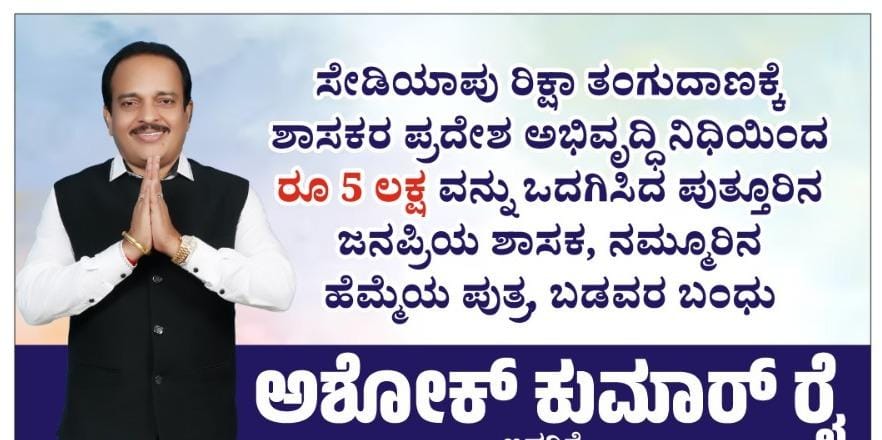 ಕೋಡಿಂಬಾಡಿ ಗ್ರಾಮ ಪಂಚಾಯತ್ ವ್ಯಾಪ್ತಿಯ ಸೇಡಿಯಾಪು ಎಂಬಲ್ಲಿ  ಅಶೋಕ್ ಕುಮಾರ್ ರೈ ಯವರ ಪ್ರದೇಶ ಅಭಿವೃದ್ಧಿ ಅನುದಾನದಿಂದ, ಅಂದಾಜು 5ಲಕ್ಷ ರೂಪಾಯಿ ವೆಚ್ಚ ದಲ್ಲಿ ನೂತನವಾಗಿ ನಿರ್ಮಿಸಲಾದ ರಿಕ್ಷಾ ತಂಗುದಾಣವನ್ನು ಶಾಸಕರಾದ ಅಶೋಕ್ ಕುಮಾರ್ ರೈಯವರು ಜ 18 ಆದಿತ್ಯವಾರ ಬೆಳಿಗ್ಗೆ 10:30ಕ್ಕೆ ಸರಿಯಾಗಿ ಉದ್ಘಾಟಿಸಲಿದ್ದಾರೆ, ಈ ಕಾರ್ಯಕ್ರಮಕ್ಕೆ ಹೆಚ್ಚಿನ ಸಂಖ್ಯೆ ಯಲ್ಲಿ ಜನರು ಆಗಮಿಸಬೇಕಾಗಿ ವಿನಂತಿಸಲಾಗಿದೆ.