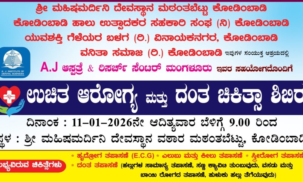 ಶ್ರೀ ಮಹಿಷಮರ್ದಿನಿ ದೇವಸ್ಥಾನ ಮಠಂತಬೆಟ್ಟು ಕೋಡಿಂಬಾಡಿ, ಹಾಲು ಉತ್ಪಾದಕರ ಸಹಕಾರಿ ಸಂಘ (ನಿ.) ಕೋಡಿಂಬಾಡಿ,ಯುವಶಕ್ತಿ ಗೆಳೆಯರ ಬಳಗ (ರಿ.) ವಿನಾಯಕನಗರ, ಕೋಡಿಂಬಾಡಿ ವನಿತ ಸಮಾಜ (ರಿ) ಕೋಡಿಂಬಾಡಿ ಇವರ ಸಂಯುಕ್ತ ಆಶ್ರಯದಲ್ಲಿ A.J, ಆಸ್ಪತ್ರೆ &...