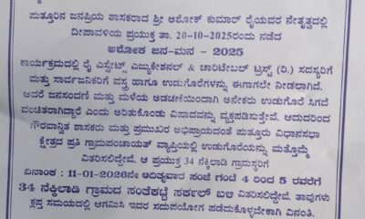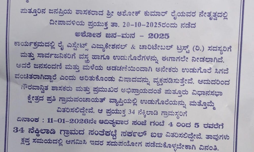 ಫುತ್ತೂರಿನ ಜನಪ್ರಿಯ ಶಾಸಕರಾದ ಶ್ರೀ ಆಶೋಕ್ ಕುಮಾರ್ ರೈಯವರ ನೇತೃತ್ವದಲ್ಲಿ ರೈ ಎಸ್ಟೇಟ್ಸ್ ಎಜ್ಯುಕೇಶನಲ್ & ಚಾರಿಟೇಬಲ್ ಟ್ರಸ್ಟ್ ವತಿಯಿಂದ ನೆಕ್ಕಿಲಾಡಿ. ಗ್ರಾಮ ದ ಸಾರ್ವಜನಿಕರಿಗೆ ವಸ್ತ್ರ ಹಾಗೂ ಉಡುಗೊರೆ ಗಳನ್ನು ದಿನಾಂಕ: 11-01-2026ನೇ ಅದಿತ್ಯವಾರ...