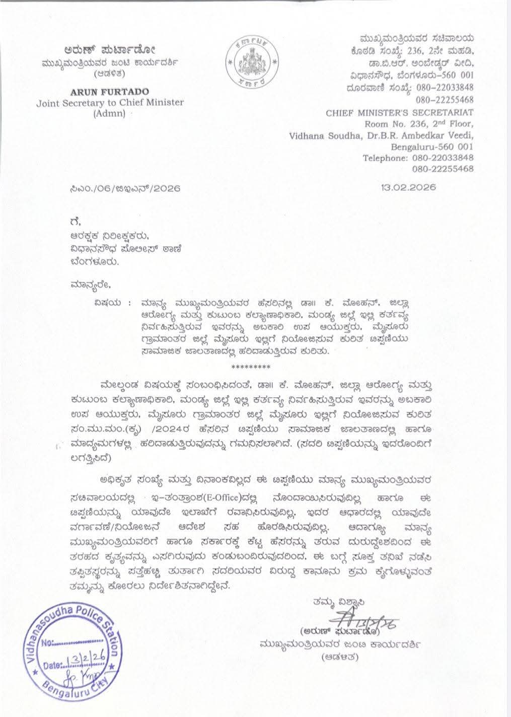 ಯಾರೋ ಕೆಲವು ಕಿಡಿಗೇಡಿಗಳು ನನ್ನ ಕಚೇರಿಯ ನಕಲಿ ಟಿಪ್ಪಣಿಯೊಂದನ್ನು ಸೃಷ್ಟಿಸಿ, ಮಂಡ್ಯ ಜಿಲ್ಲೆ ಆರೋಗ್ಯ ಮತ್ತು ಕುಟುಂಬ ಕಲ್ಯಾಣಾಧಿಕಾರಿಯಾದ ಡಾ||ಕೆ.ಮೋಹನ್ ಇವರನ್ನು ಮೈಸೂರು ಗ್ರಾಮಾಂತರದ ಅಬಕಾರಿ ಉಪ ಆಯುಕ್ತರಾಗಿ ವರ್ಗಾವಣೆ ಮಾಡಲಾಗಿದೆ ಎಂದು ಸಾಮಾಜಿಕ ಜಾಲತಾಣಗಳಲ್ಲಿ ಹರಿಬಿಟ್ಟು, ಅಪಪ್ರಚಾರದಲ್ಲಿ ತೊಡಗಿರುವುದು ಖಂಡನೀಯ ಮತ್ತು ಅತ್ಯಂತ ಗಂಭೀರ ಸ್ವರೂಪದ ಅಪರಾಧವಾಗಿದೆ. ಈ ಬಗ್ಗೆ ನನ್ನ ಸಚಿವಾಲಯದ ಅಧಿಕಾರಿಗಳು ದೂರು ದಾಖಲಿಸಿದ್ದು, ಪೊಲೀಸ್ ಇಲಾಖೆ ಇದರ ಹಿಂದಿರುವ ದುಷ್ಟರನ್ನು ಪತ್ತೆ ಮಾಡಿ, ಕಾನೂನು ಕ್ರಮ ಕೈಗೊಳ್ಳಲಿದೆ.