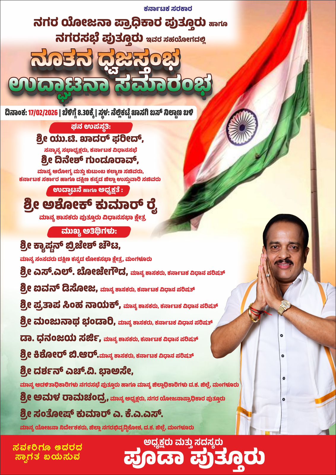 ಪುತ್ತೂರು:ನಗರ ಯೋಜನಾ ಪ್ರಾಧಿಕಾರ ಪುತ್ತೂರು ಹಾಗೂ ನಗರಸಭೆ ಪುತ್ತೂರು ಇವರ ಸಹಯೋಗದಲ್ಲಿ ರಾಜ್ಯದ ಅತಿ ಎತ್ತರದ ಮೂರನೇ ನೂತನ ಧ್ವಜಸ್ತಂಭ ನಾಳೆ (17) ಉದ್ಘಾಟನಾ ದಿನಾಂಕ: 17/02/2026 | ಬೆಳಿಗ್ಗೆ 8.30ಕ್ಕೆ | ಸ್ಥಳ: ನೆಲ್ಲಿಕಟ್ಟೆ ಖಾಸಗಿ ಬಸ್ ನಿಲ್ದಾಣ ಬಳಿ ಘನ ಉಪಸ್ಥತಿ: ಶ್ರೀ ಯು.ಟಿ. ಖಾದರ್ ಫರೀದ್, ಸನ್ಮಾನ್ಯ ಸಭಾಧ್ಯಕ್ಷರು, ಕರ್ನಾಟಕ ವಿಧಾನಸಭೆ ಶ್ರೀ ದಿನೇಶ್ ಗುಂಡೂರಾವ್, ಮಾನ್ಯ ಆರೋಗ್ಯ ಮತ್ತು ಕುಟುಂಬ ಕಲ್ಯಾಣ ಸಚಿವರು, ಕರ್ನಾಟಕ ಸರ್ಕಾರ ಹಾಗೂ ದಕ್ಷಿಣ ಕನ್ನಡ ಜಿಲ್ಲಾ ಉಸ್ತುವಾರಿ ಸಚಿವರು ಉದ್ಘಾಟನೆ ಹಾಗೂ ಅಧ್ಯಕ್ಷತೆ : ಶ್ರೀ ಅಶೋಕ್ ಕುಮಾರ್ ರೈ ಮಾನ್ಯ ಶಾಸಕರು ಪುತ್ತೂರು ವಿಧಾನಸಭಾ ಕ್ಷೇತ್ರ