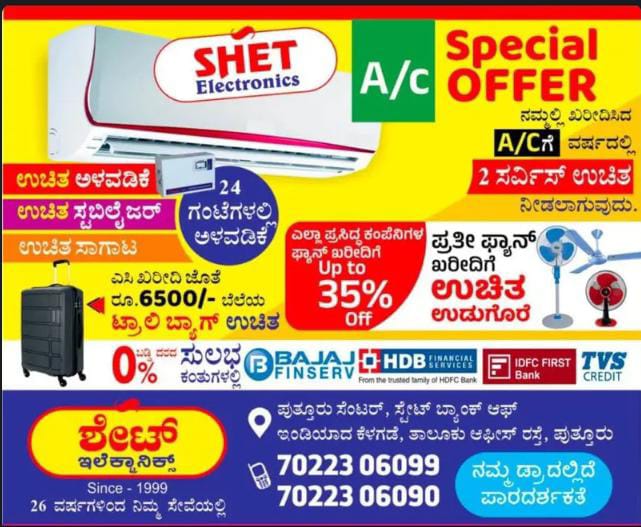 ಪುತ್ತೂರು: ಕಳೆದ 26 ವರ್ಷಗಳಿಂದ ಗ್ರಾಹಕರಿಗೆ ನಗುಮೊಗದ ಸೇವೆ ನೀಡುತ್ತಾ ,ಉತ್ತಮ ಗುಣಮಟ್ಟದ ಎಲೆಕ್ಟ್ರಾನಿಕ್ಸ್ ವಸ್ತುಗಳ ಮಾರಾಟದಲ್ಲಿ ಹೆಸರುವಾಸಿಯಾಗಿರುವ, ಪುತ್ತೂರಿನ ಕೋರ್ಟ್ ರಸ್ತೆಯಲ್ಲಿ ವಿಶಾಲ ಮಳಿಗೆಯನ್ನು ಹೊಂದಿರುವ ಶೇಟ್ ಎಲೆಕ್ಟ್ರಾನಿಕ್ಸ್ ನಲ್ಲಿ ಈ ಸುಡು ಬಿಸಿಲಿನ ಧಗೆಗೆ ಏರ್ ಕಂಡೀಷನರ್ ಖರೀದಿಗೆ ಆಫರ್ ಗಳ ಸುರಿಮಳೆಯನ್ನು ನೀಡಲಾಗುತ್ತಿದೆ.