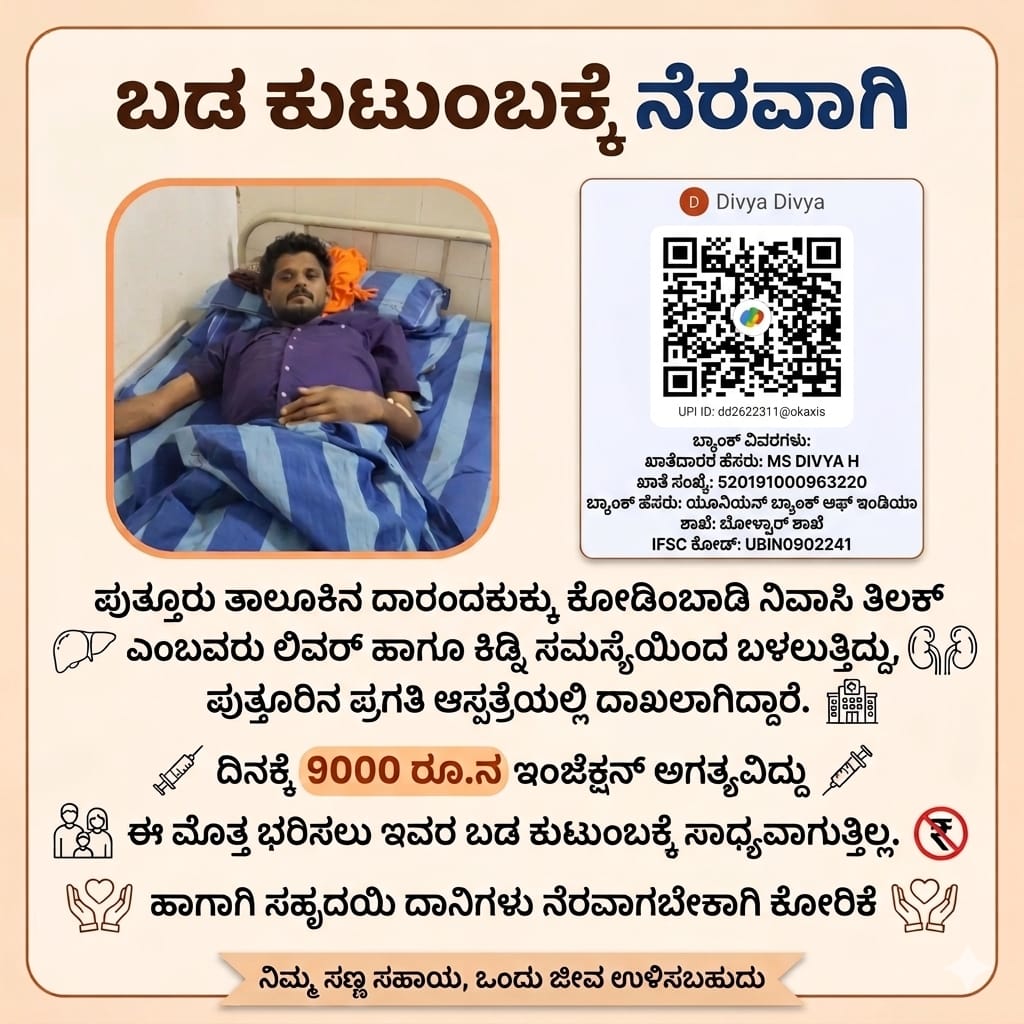 ಕೋಡಿಂಬಾಡಿ ಗ್ರಾಮದ ದಾರಂದಕುಕ್ಕು(ಸೇಡಿಯಪು. ಕಾಲನಿ )ನಿವಾಸಿ ತಿಲಕ್ ಎಂಬವರು ಪ್ರಗತಿ ಆಸ್ಪತ್ರೆ ಯಲ್ಲಿ ಚಿಕಿತ್ಸೆ ಪಡೆಯುತ್ತಿದ್ದು, ಕುಟುಂಬ ಬಹಳ ಬಡತನದಿಂದ ವಿರುವು ದರಿಂದ, ಚಿಕಿತ್ಸೆಗೆ ಹೆಚ್ಚಿನ ಹಣದ ಅವಶ್ಯಕತೆವಿದೆ,ಆದುದರಿಂದ ಸಹೃದಯಿ ದಾನಿಗಳು ಸಹಾಯ ನೀಡುವಂತೆ ಈ ಮೂಲಕ ವಿನಂತಿಸಲಾಗಿದೆ.