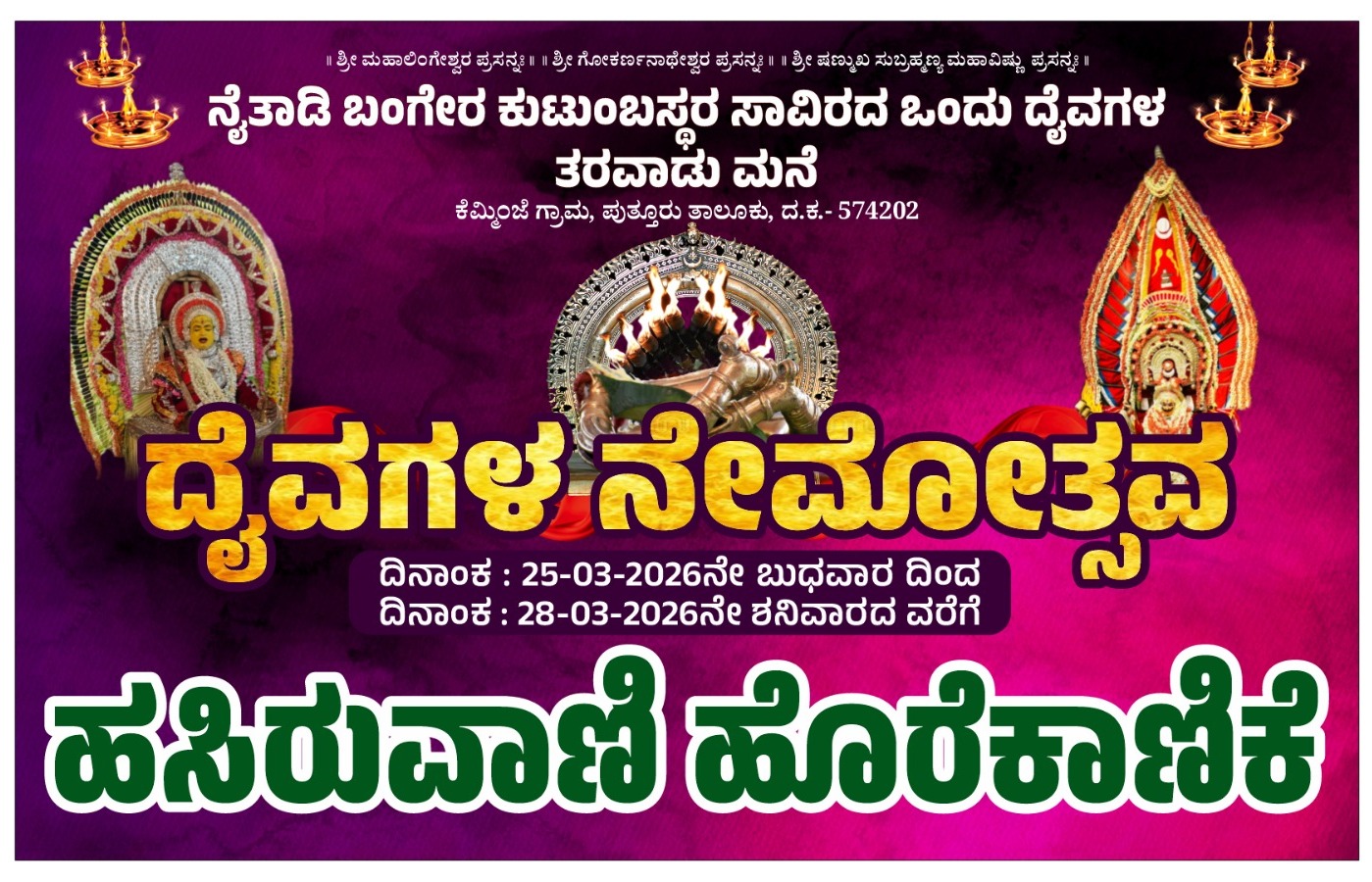 ಪುತ್ತೂರು:ಸುಮಾರು 56 ವರ್ಷಗಳ ಇತಿಹಾಸವಿರುವ ಕೆಮ್ಮಿಂಜೆ ಗ್ರಾಮದ ನೈತಾಡಿ ಬಂಗೇರ ಕುಟುಂಬಸ್ಥರ ಸಾವಿರದ ಒಂದು ದೈವಗಳ ತರವಾಡು ಮನೆಯಲ್ಲಿ ದೈವಗಳ ನೇಮೋತ್ಸವ ಕಾರ್ಯಕ್ರಮ ಮಾ.25 ರಿಂದ 28ರ ವರೆಗೆ ವಿಜ್ರಂಭಣೆಯಿಂದ ಜರಗಲಿದೆ. ಇಂದು ಸಂಜೆ ಗಂಟೆ 4 ರಿಂದ ಮುಂಡೂರಿನಿಂದ ನೈತಾಡಿವರೆಗೆ ಹೊರ ಕಾಣಿಕೆ ಮೆರವಣಿಗೆ ನಡೆಯಲಿದೆ.