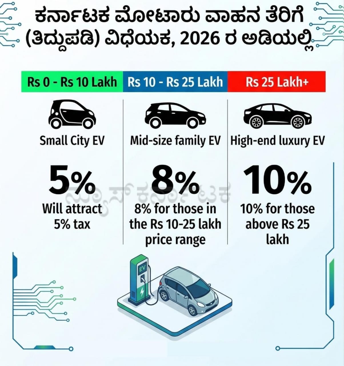 ಕರ್ನಾಟಕ ಸರ್ಕಾರವು ಎಲೆಕ್ಟ್ರಿಕ್ ವಾಹನ (EV) ಖರೀದಿದಾರರಿಗೆ ಶಾಕಿಂಗ್ ಸುದ್ದಿಯೊಂದನ್ನು ನೀಡಿದೆ. ಇತ್ತೀಚೆಗೆ ಮಂಡಿಸಲಾದ ‘ಕರ್ನಾಟಕ ಮೋಟಾರು ವಾಹನಗಳ ತೆರಿಗೆ (ತಿದ್ದುಪಡಿ) ವಿಧೇಯಕ, 2026’ ರ ಅಡಿಯಲ್ಲಿ, ಇನ್ಮುಂದೆ ಎಲೆಕ್ಟ್ರಿಕ್ ವಾಹನಗಳ ಮೇಲೆ ಹೊಸ ತೆರಿಗೆಯನ್ನು ವಿಧಿಸಲಾಗುತ್ತಿದೆ. ಈ ಹಿಂದೆ ಇವಿ ವಾಹನಗಳಿಗೆ ನೀಡಲಾಗುತ್ತಿದ್ದ ತೆರಿಗೆ ವಿನಾಯಿತಿಯಲ್ಲಿ ಈಗ ಬದಲಾವಣೆ ತರಲಾಗಿದ್ದು, ವಾಹನದ ಬೆಲೆಗೆ ಅನುಗುಣವಾಗಿ 5% ರಿಂದ 10% ವರೆಗೆ ತೆರಿಗೆ ಅನ್ವಯವಾಗಲಿದೆ.