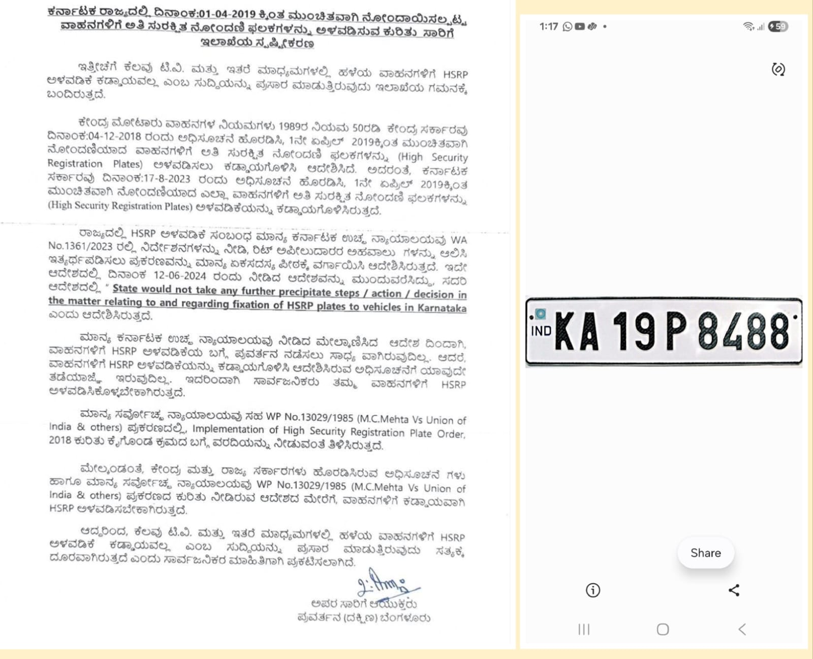 ಸಾರಿಗೆ ಇಲಾಖೆಯ ಪ್ರಕಾರ 01 ಏಪ್ರಿಲ್ 2019ಕ್ಕಿಂತ ಮೊದಲು ನೋಂದಾಯಿತವಾಗಿರುವ ಎಲ್ಲಾ ವಾಹನಗಳಿಗೆ ಹೆಚ್ಎಸ್ಆರ್ಪಿ ನಂಬರ್ ಪ್ಲೇಟ್ ಅಳವಡಿಸುವುದು ಕಡ್ಡಾಯವಾಗಿದ್ದು, ಈ ನಿಯಮದಲ್ಲಿ ಯಾವುದೇ ಬದಲಾವಣೆ ಆಗಿಲ್ಲ ಎಂದು ತಿಳಿಸಿದೆ. ರಾಜ್ಯದ ಎಲ್ಲಾ ವಾಹನ ಮಾಲೀಕರು ತಮ್ಮ ಹಳೆಯ ವಾಹನಗಳಿಗೆ ತಕ್ಷಣವೇ ಹೆಚ್ಎಸ್ಆರ್ಪಿ ನಂಬರ್ ಪ್ಲೇಟ್ ಅಳವಡಿಸಿಕೊಳ್ಳುವಂತೆ ಇಲಾಖೆ ಮನವಿ ಮಾಡಿದೆ.