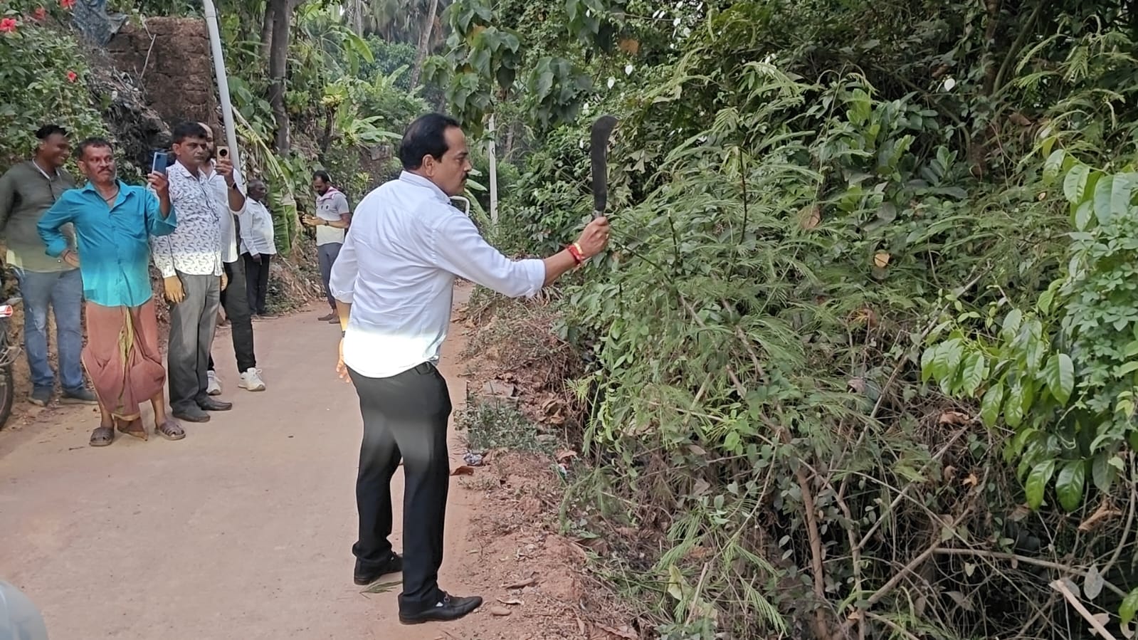 ಭಾನುವಾರ ನಗರದ ಮಂಜಲ್ಪಡ್ಪು ಕಾಲನಿಗೆ ಭೇಟಿ ನೀಡಿ ರಸ್ತೆ ಉದ್ಘಾಟಿಸಿ ಮರಳುತ್ತಿರುವ ವೇಳೆ ರಸ್ತೆಗೆ ಅಡ್ಡವಾಗಿ ಬೆಳೆದಿದ್ದ ಮುಳ್ಳಿನ ಗಿಡವನ್ನು ಶಾಸಕರೇ ಕತ್ತರಿಸುವ ಮೂಲಕ ಮಾದರಿಯಾಗಿದ್ದಾರೆ. ರಸ್ತೆ ಮಧ್ಯದ ವರೆಗೂ ಮುಳ್ಳಿನ ಗಿಡ ಬೆಳೆದಿದ್ದ ಕಾರಣ ವಾಹನ ಹಾಗೂ ಜನ ಸಂಚಾರಕ್ಕೆ ಅಡ್ಡಿಯಾಗುತ್ತಿತ್ತು,ಪಕ್ಕದ ಮನೆಯವರಿಂದ ಕತ್ತಿ ತೆಗೆದು ಮುಳ್ಳನ್ನು ಕತ್ತರಿಸಿದ್ದಾರೆ.