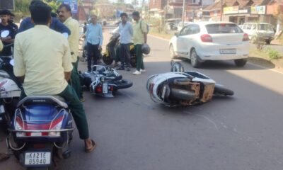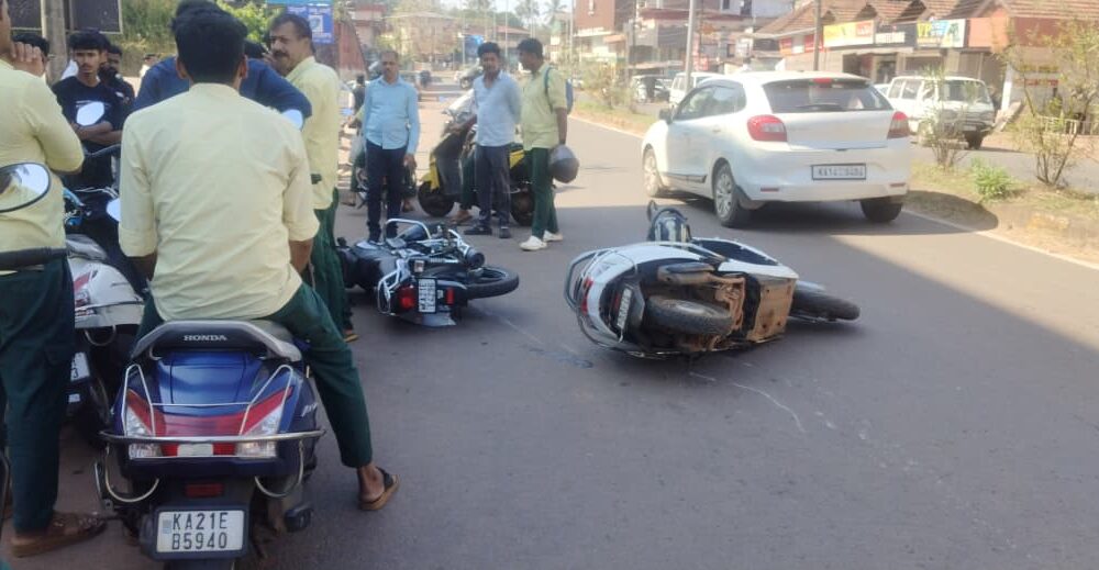 ಪುತ್ತೂರು: ಡಿ.11.ಪುತ್ತೂರು ಹೃದಯ ಭಾಗವಾದ ದರ್ಬೆ ವಿಶಾಲ್ ಮಾಲ್ ಎದುರು ಬೈಕ್ ನಡುವೆ ಅಪಘಾತ ಸಂಭವಿಸಿ 3 ಬೈಕುಗಳು ಹಾನಿಯಾಗಿದೆ. ಬೈಕ್ ಸವಾರರಿಗೆ ಅಲ್ಪಸ್ವಲ್ಪ ಗಾಯಗಳಾಗಿದ್ದು ಹೆಚ್ಚಿನ ಮಾಹಿತಿ ತಿಳಿದು ಬಂದಿರುವುದಿಲ್ಲ.