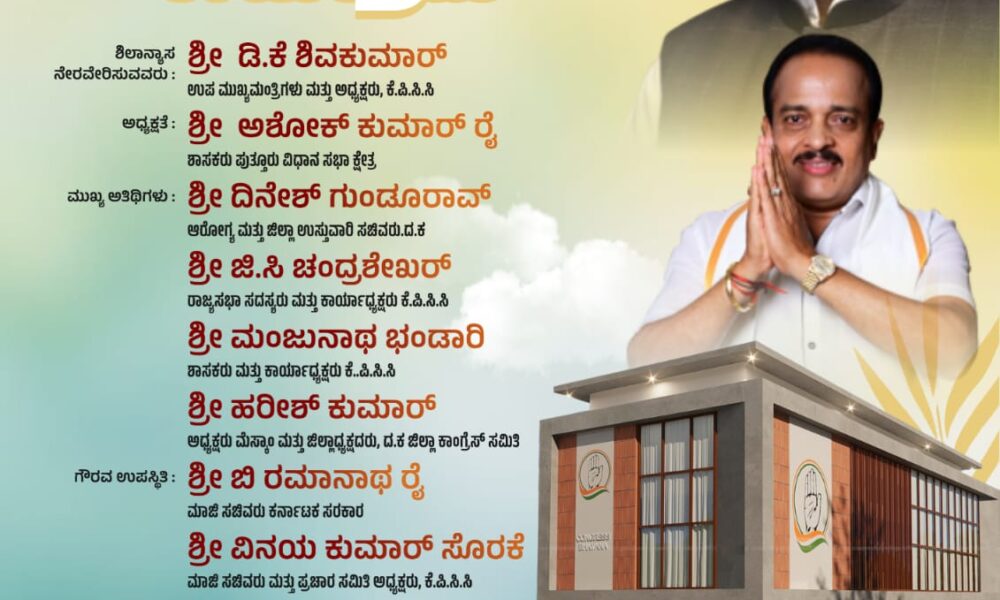 ಪುತ್ತೂರು: ಕಾಂಗ್ರೆಸ್ ಭವನ ಟ್ರಸ್ಟ್(ರಿ.) ಪುತ್ತೂರು, ಕಾಂಗ್ರೆಸ್ ಕಛೇರಿಯ ಶಿಲಾನ್ಯಾಸ ಕಾರ್ಯಕ್ರಮವು ಪುತ್ತೂರು ಬಸ್ ನಿಲ್ದಾಣದ ಮುಂಭಾಗ ಫೆ.6 ಶುಕ್ರವಾರ ಸಂಜೆ 5.30ಕ್ಕೆ ನಡೆಯಲಿದೆ. ಡಿ.ಕೆ. ಶಿವಕುಮಾರ್, ಉಪ ಮುಖ್ಯಮಂತ್ರಿಗಳು ಮತ್ತು ಅಧ್ಯಕ್ಷರು ಕೆ.ಪಿ.ಸಿ.ಸಿ, ಇವರು...