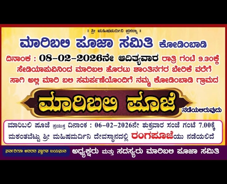*ದಿನಾಂಕ 08-02-2026ನೇ ಆದಿತ್ಯವಾರ ಸಂಜೆ 7ಕ್ಕೆ ಮಠಂತಬೆಟ್ಟು ಶ್ರೀ ಮಹಿಷಮರ್ದಿನಿ ದೇವಸ್ಥಾನದಲ್ಲಿ ರಂಗ ಪೂಜೆ ನಡೆದು ರಾತ್ರಿ 9:30ಕ್ಕೆ ಸೇಡಿಯಾಪು ನಿಂದ ಶಾಂತಿನಗರ ಸಾಗಿ ಬೇರಿಕೆಯಲ್ಲಿ ಕೋಡಿಂಬಾಡಿ ಗ್ರಾಮದ ಮಾರಿಬಲಿ ಸಮರ್ಪಣೆ ಗೊಳ್ಳಲಿದೆ.. ಊರಿನ ಎಲ್ಲಾ...