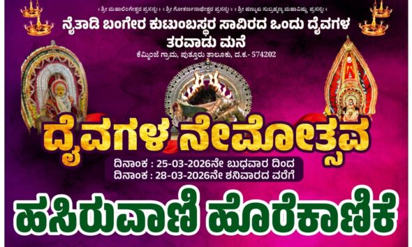 ಪುತ್ತೂರು: ಕೋಡಿಂಬಾಡಿಯ ಶಾಂತಿನಗರ ಶ್ರೀ ಸತ್ಯನಾರಾಯಣ ಪೂಜಾ ಸಮಿತಿ ವತಿಯಿಂದ ೩೭ನೇ ವರ್ಷದ ಸಾರ್ವಜನಿಕ ಶ್ರೀ ಸತ್ಯನಾರಾಯಣ ವ್ರತ ಪೂಜೆ ಮತ್ತು ಸಾಂಸ್ಕೃತಿಕ ವೈವಿಧ್ಯ ಮಾ.೧ರಂದು ನಡೆಯಲಿದೆ. ಬೆಳಿಗ್ಗೆ ಶಾಂತಿನಗರ ಪೂಜಾ ಮೈದಾನದ ಕಟ್ಟೆಯಲ್ಲಿ...